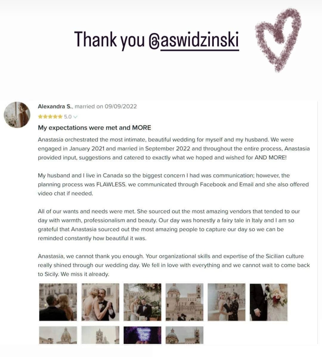 Вы утверждаете готовый проект мероприятия, дизайн-скетчи, меню, рассадку гостей, логистику и тп. Я отправляю Вам окончательную версию тайминга и жду Вас на Сицилии в день Х!