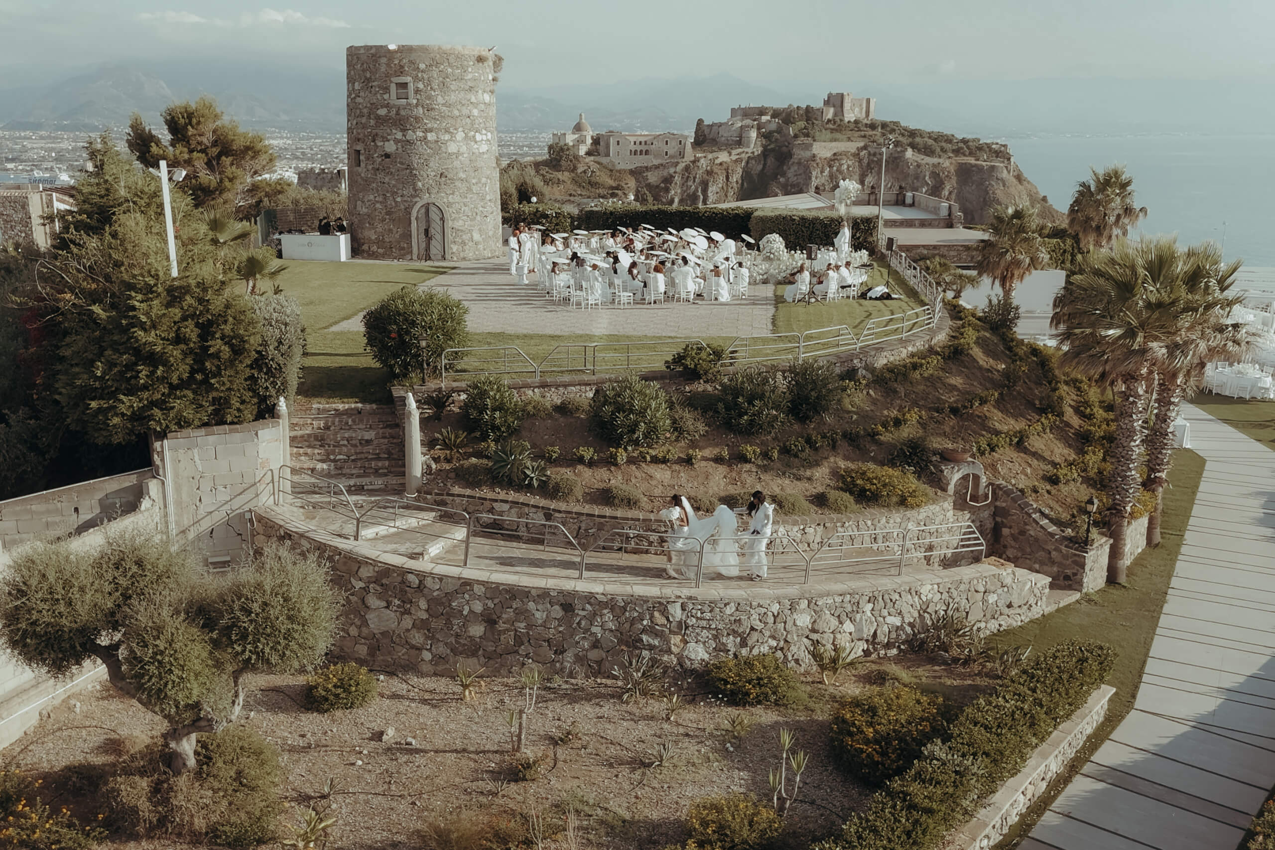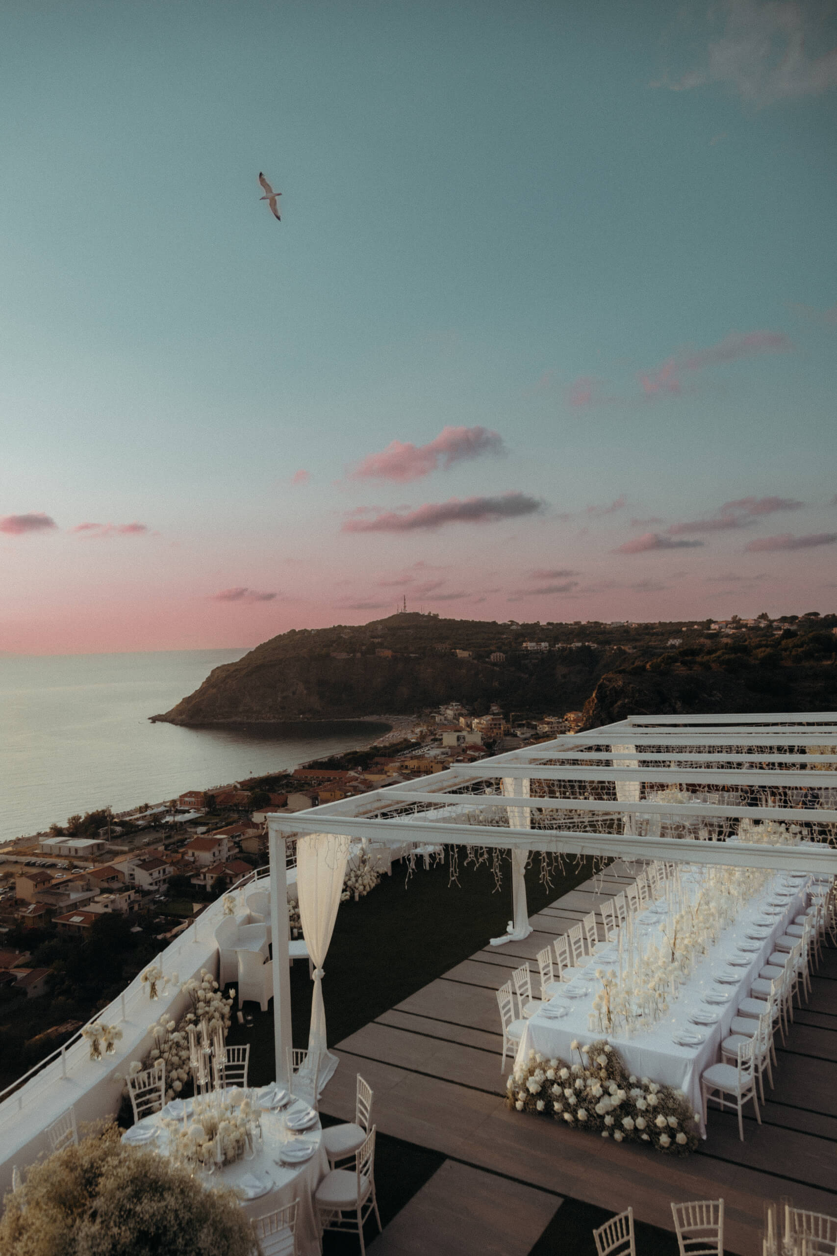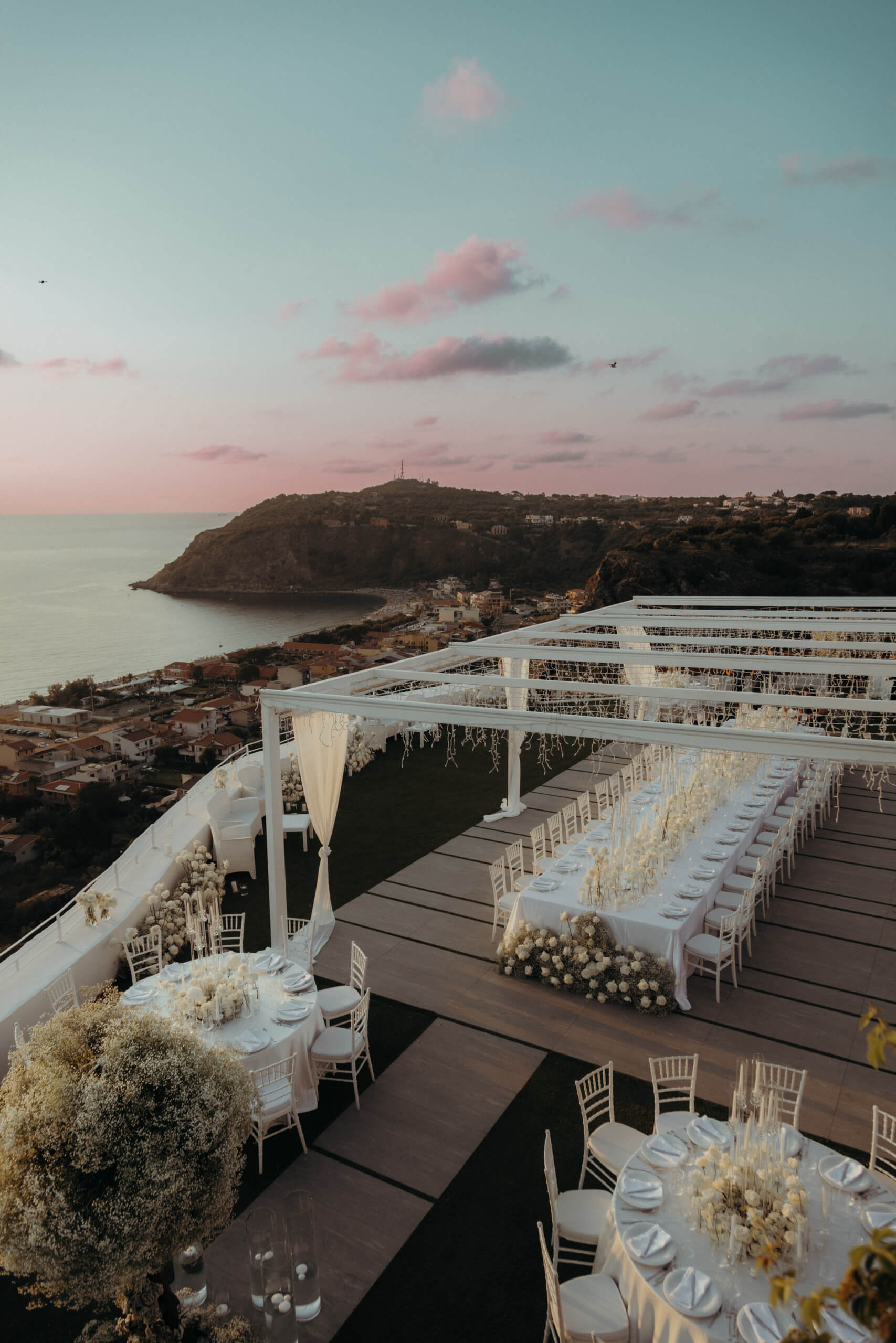I started with the crucial initial step: estimating the wedding budget and prioritizing expenses. As the design my beautiful bride envisioned was quite luxurious and required significant funding, it was essential to set budget limits for each vendor from the start of planning and vendor selection. We discovered amazing venues with excellent on-site catering, which allowed us to allocate a significant portion of the budget to the elaborate decor without exceeding the overall wedding budget. The selected venue, Villa Hera, was located about 1.5 hours from Catania Airport, but its central location in Milazzo, just a 5-10 minute drive from 4-star hotels, was very convenient for both guests and transfer arrangements.