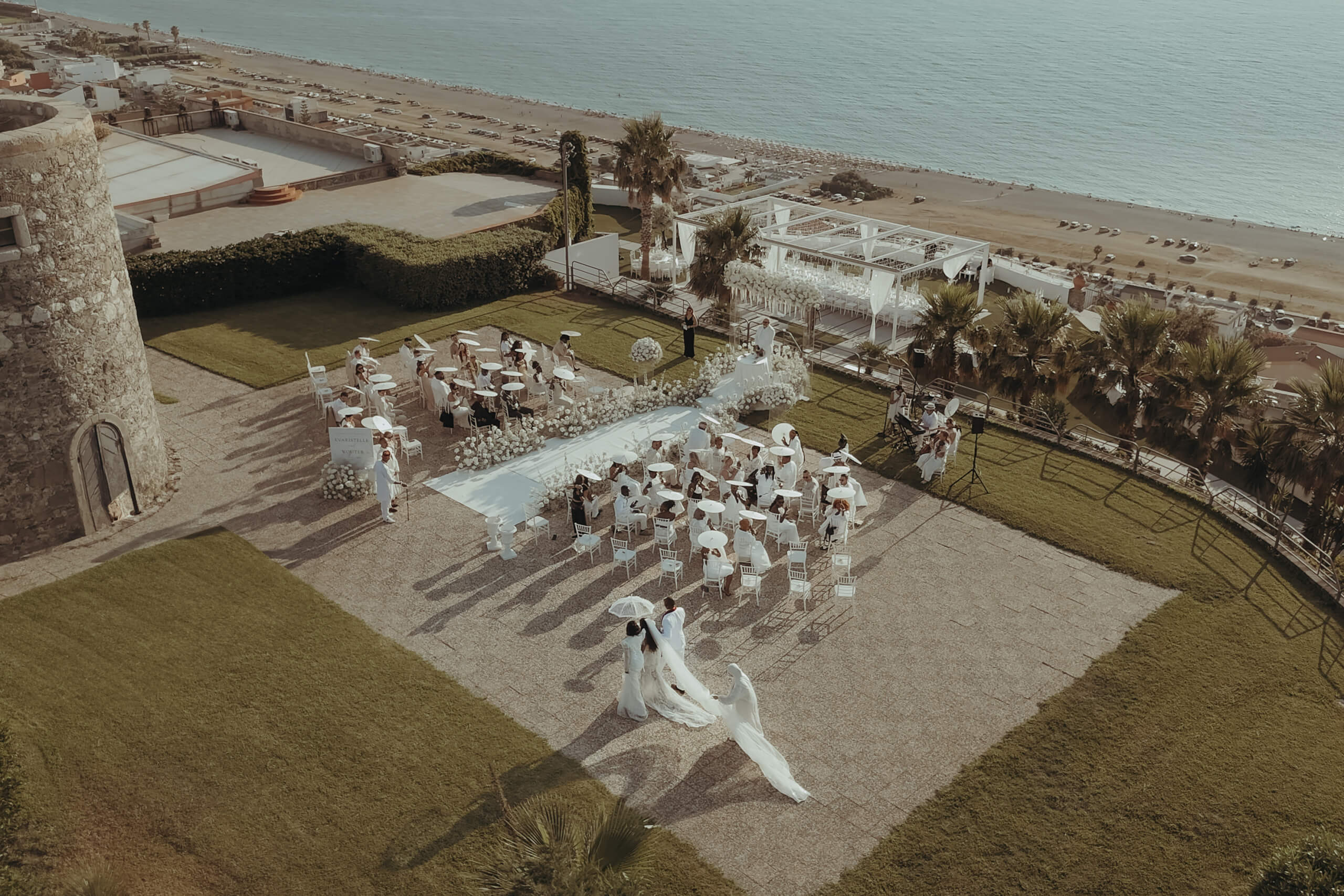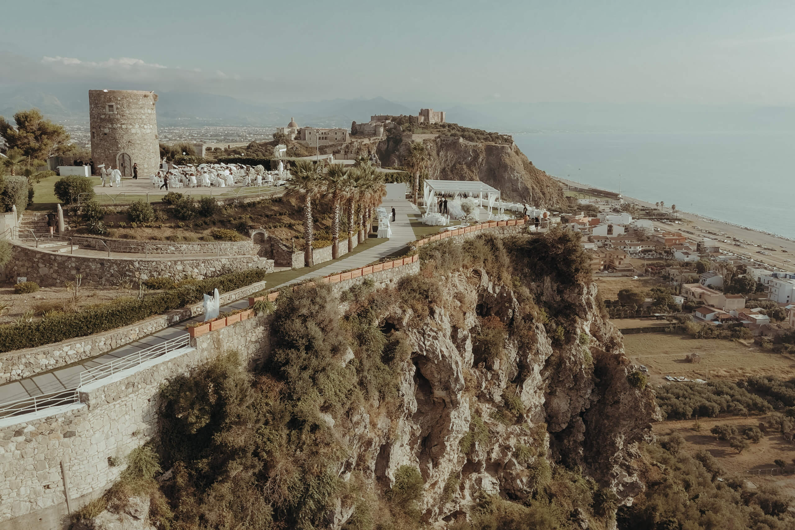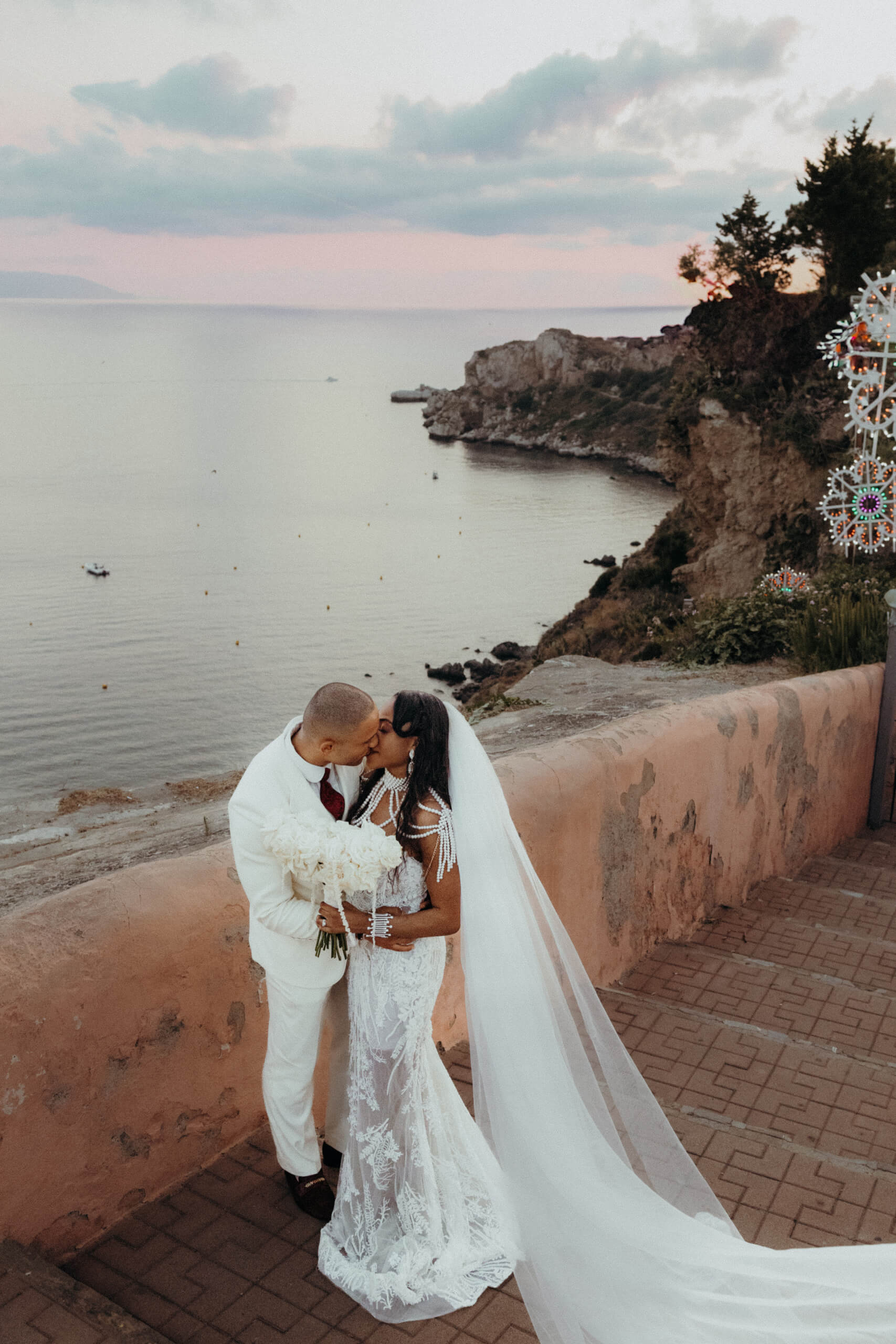 I started with the crucial initial step: estimating the wedding budget and prioritizing expenses. As the design my beautiful bride envisioned was quite luxurious and required significant funding, it was essential to set budget limits for each vendor from the start of planning and vendor selection. We discovered amazing venues with excellent on-site catering, which allowed us to allocate a significant portion of the budget to the elaborate decor without exceeding the overall wedding budget. The selected venue, Villa Hera, was located about 1.5 hours from Catania Airport, but its central location in Milazzo, just a 5-10 minute drive from 4-star hotels, was very convenient for both guests and transfer arrangements.