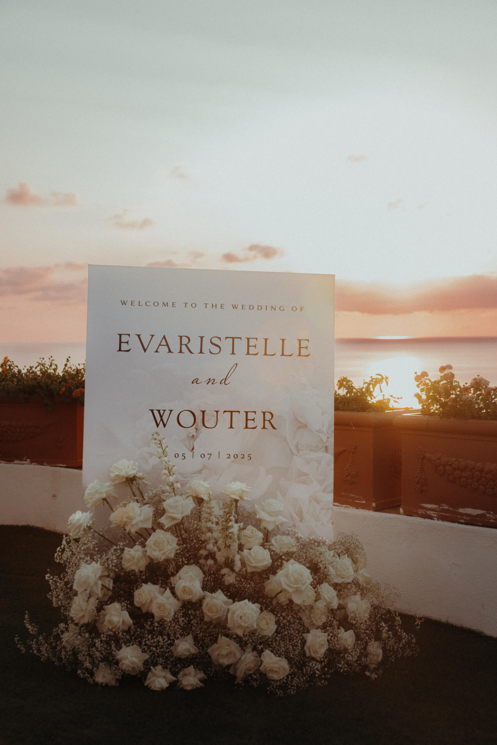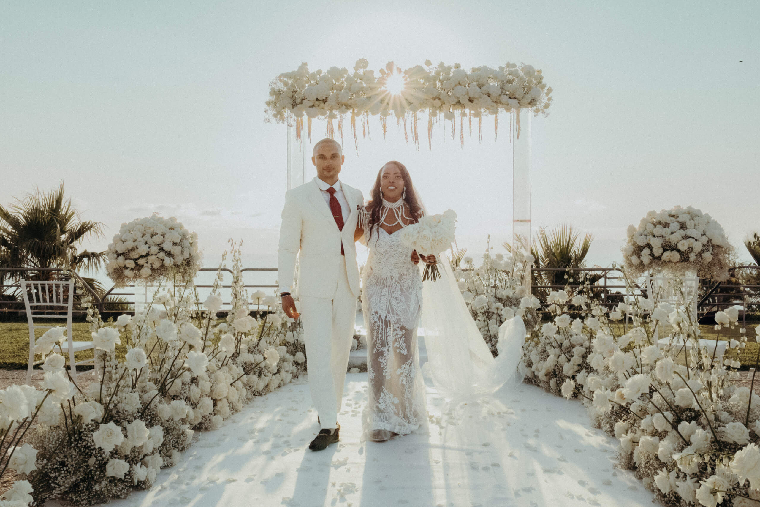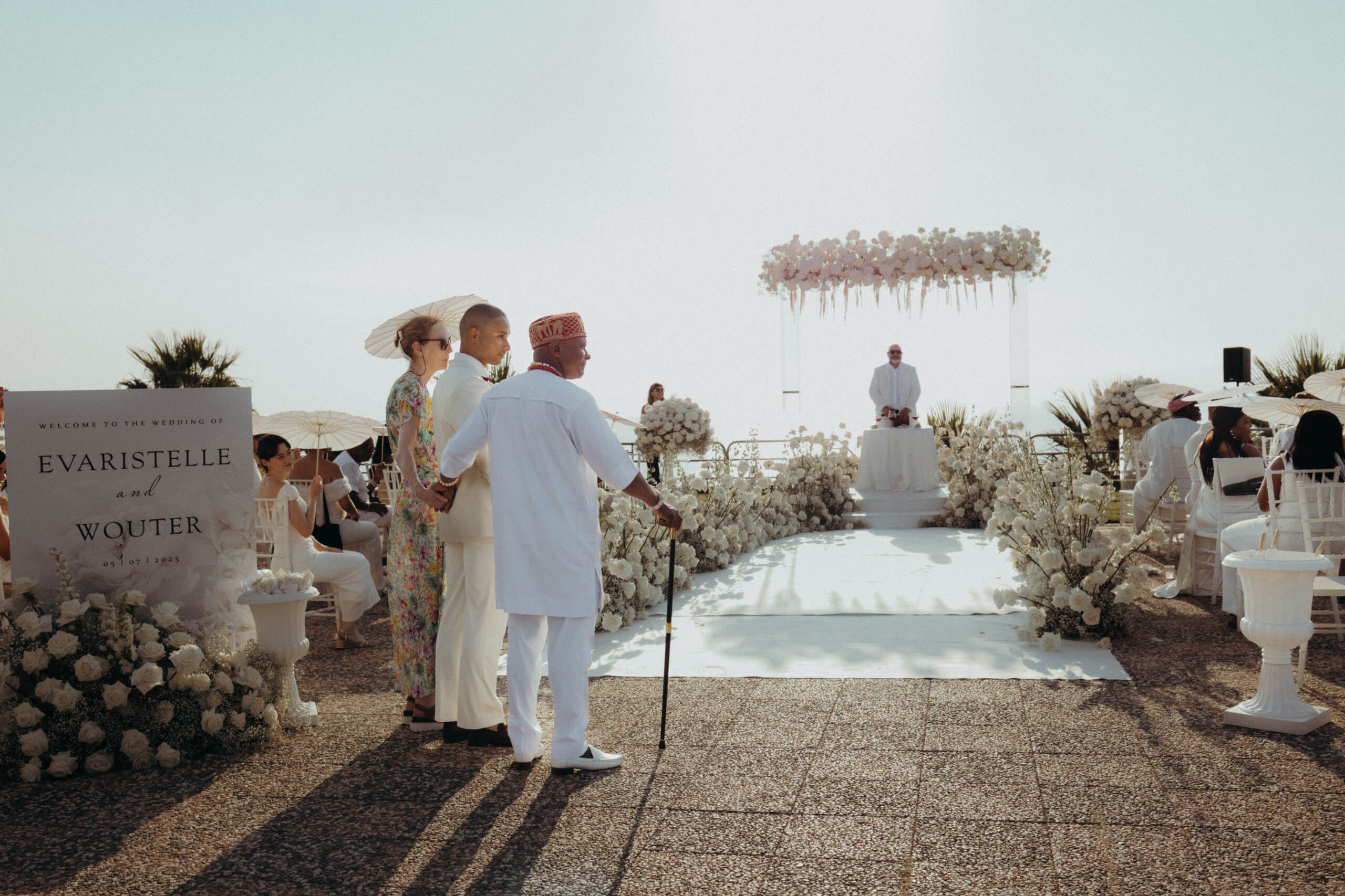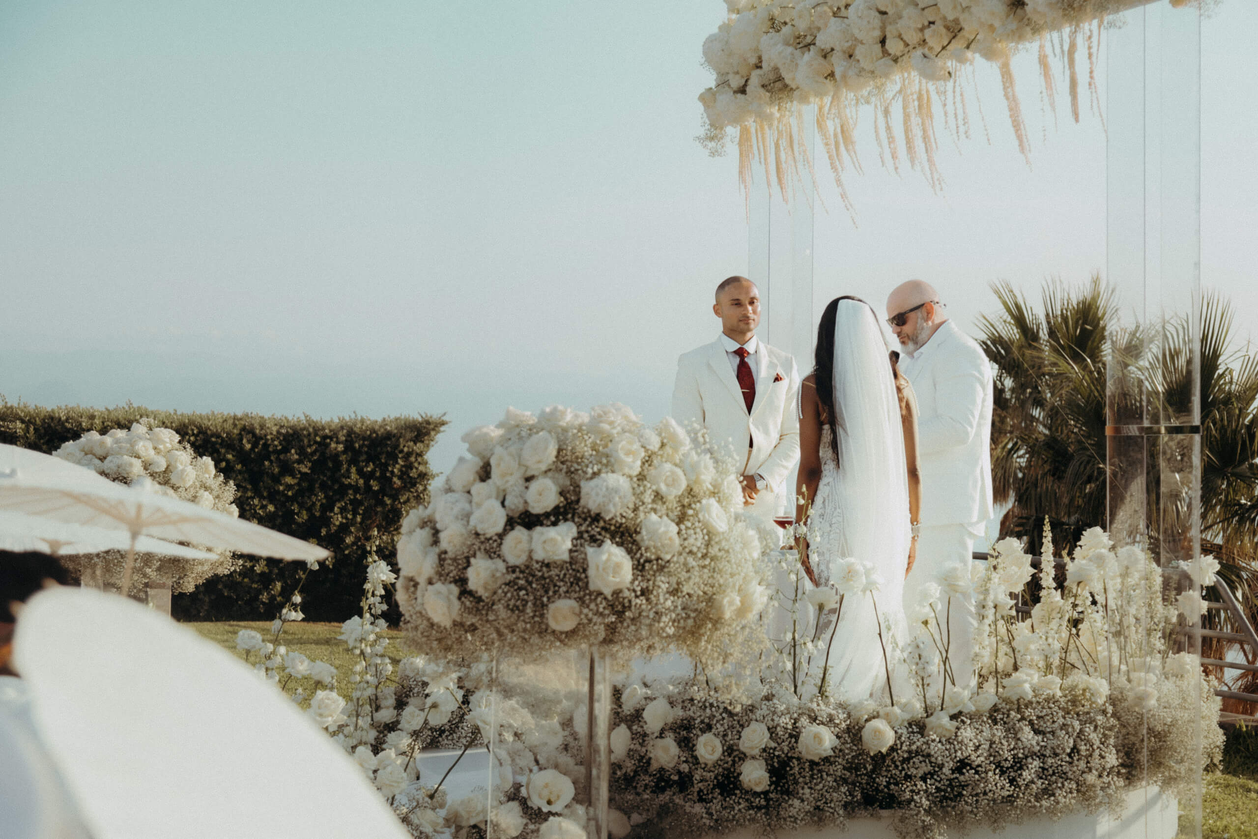 Planning this wedding was a truly challenging and remarkable experience. Evaristelle and Wouter, a couple from Benelux working in Panama, decided to gather their families and friends from all over the world to celebrate their Big Day in Sicily. Their main goal was to find an outstanding venue with breathtaking sea views and a modern, linear design featuring white and light colors. Equally important was the planning and coordination of a sophisticated, high-end wedding design, a priority highlighted by the bride from the very beginning.