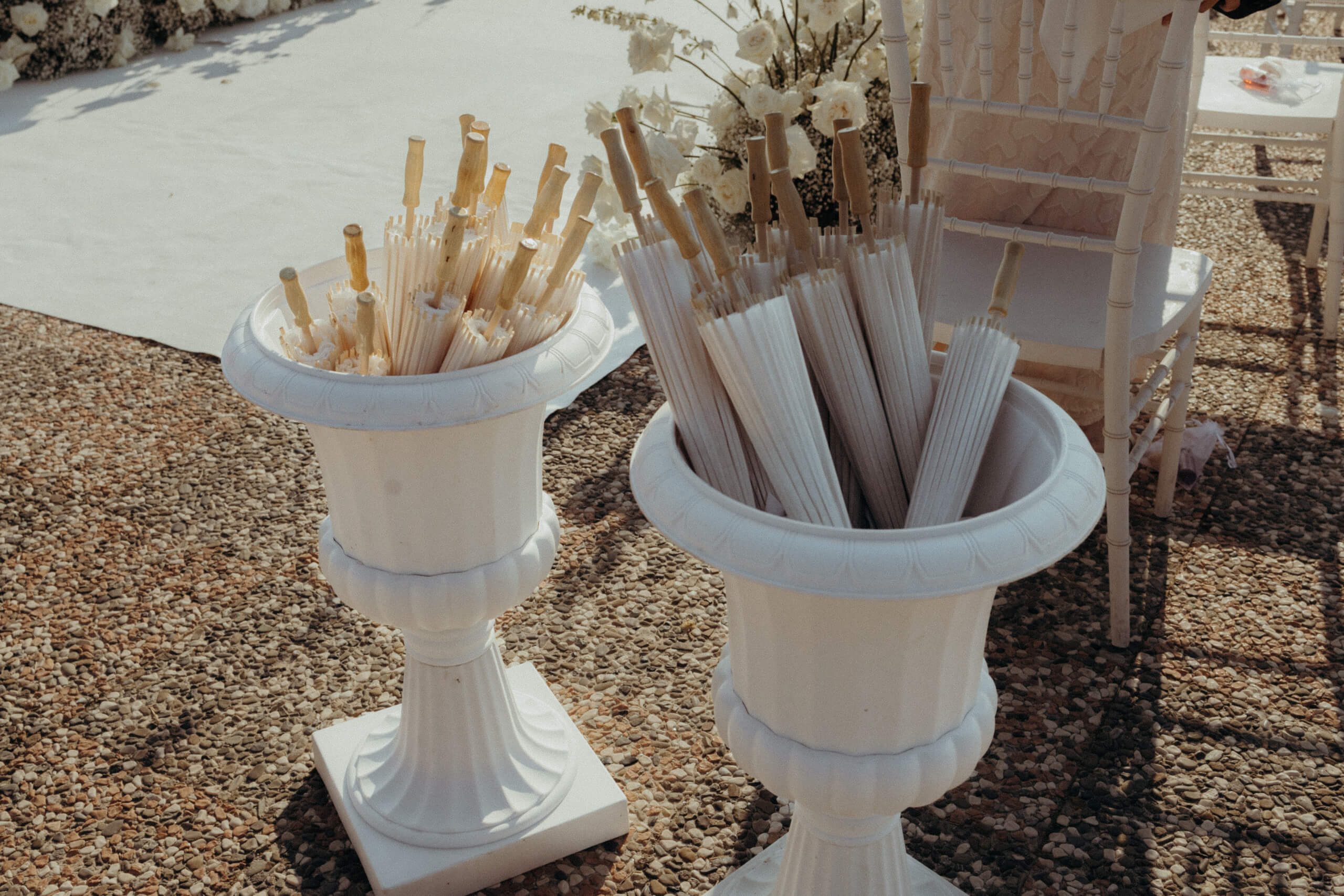 Once the venue and main vendors were booked, I prepared detailed, high-quality sketch designs of every area, from the ceremony to the reception. The main theme of the wedding decor was white, both for the flowers and the guests’ dress code. Professional sketching is vital at this stage as it allows us to understand the pros and cons of each design solution, such as flower shapes and types, quantities, lighting, table placement, chair styles, and stationery options. This greatly helps in coordinating the decoration implementation on the wedding day, managing the spaces, and identifying potential issues during the planning stage, rather than an hour before the ceremony.