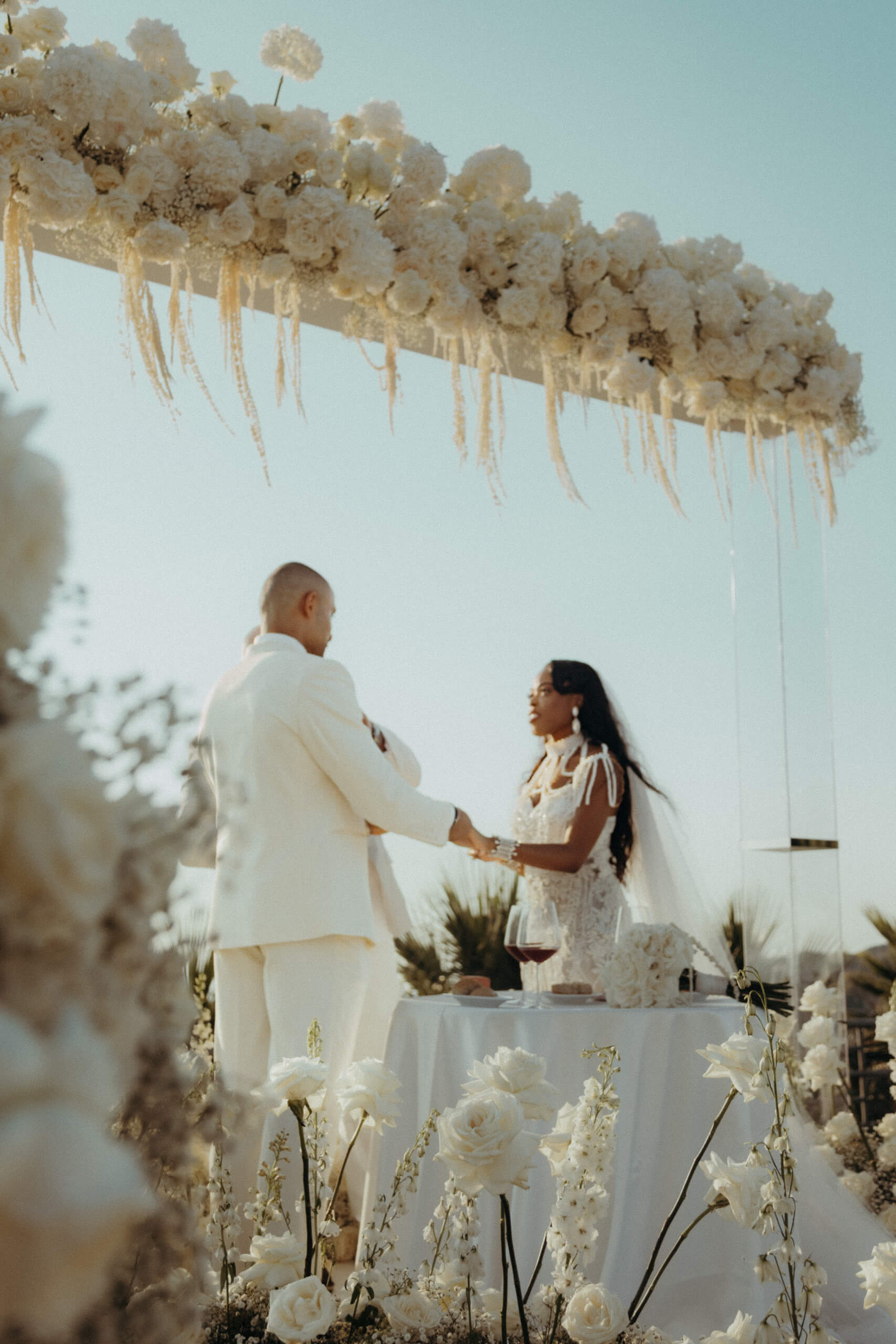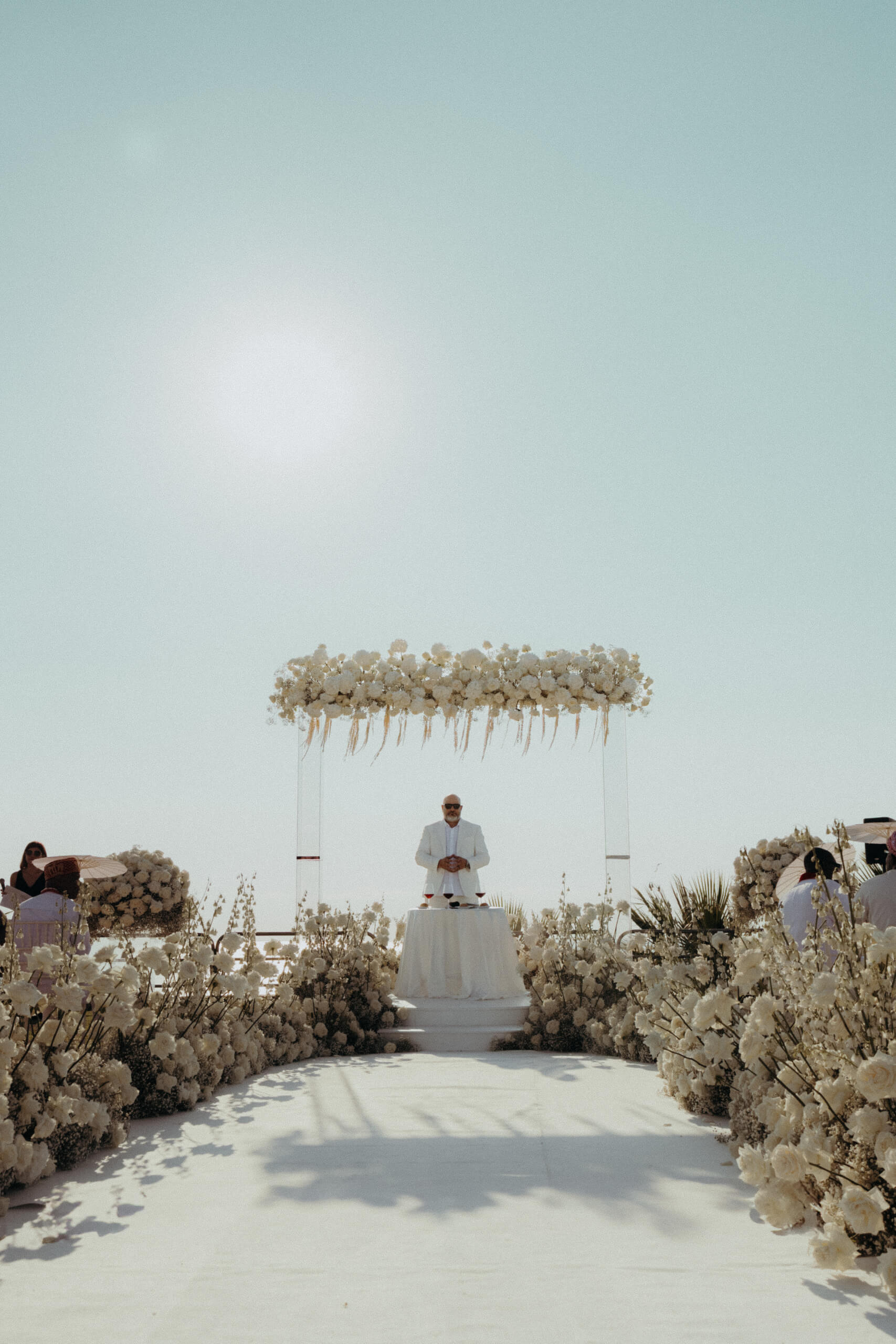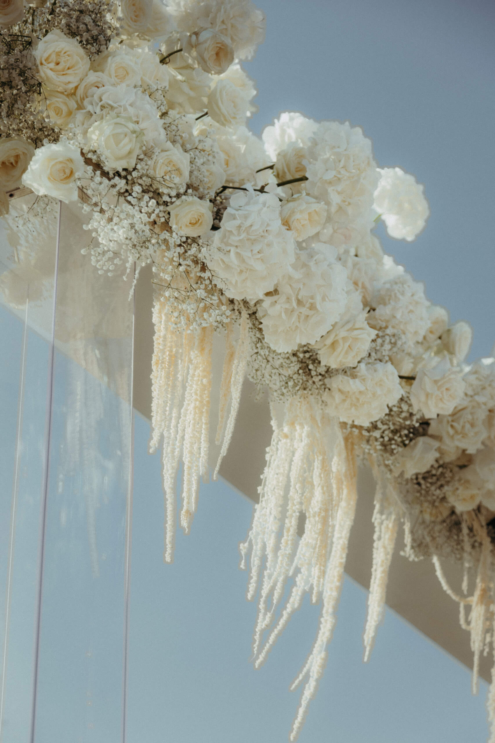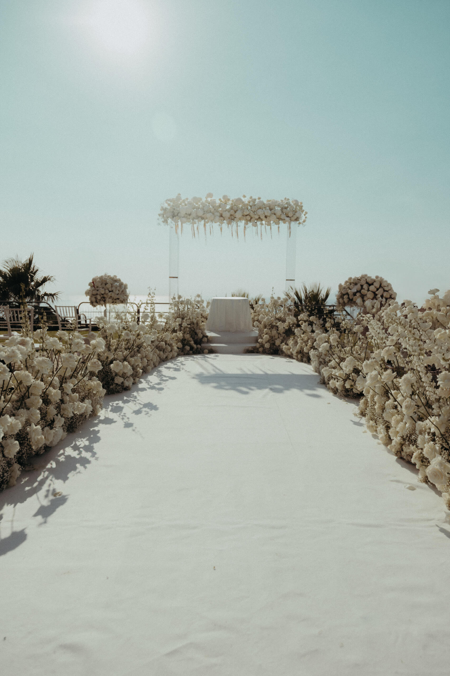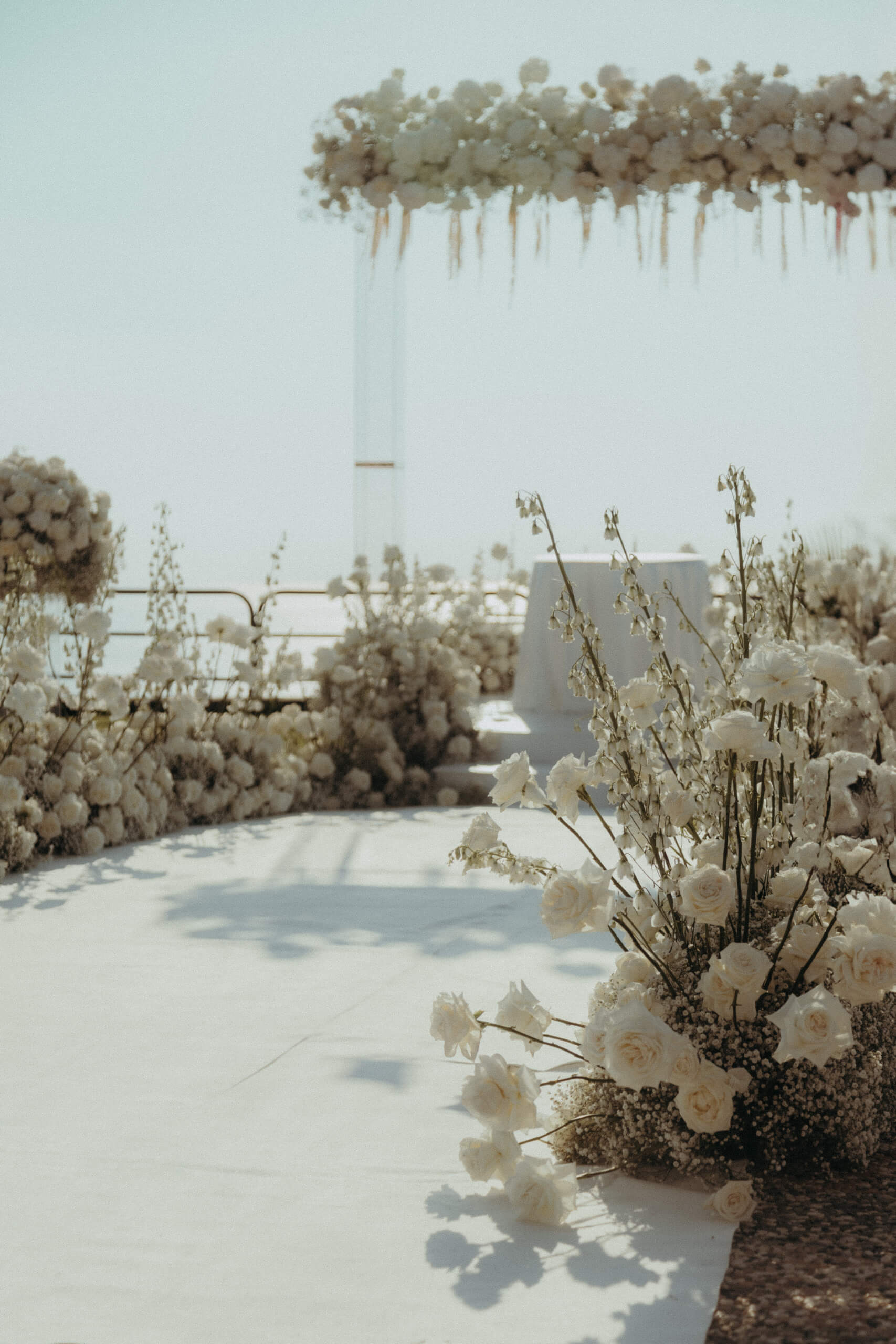 For the wedding ceremony, we built a white platform (later used for the wedding cake cutting) featuring a large, 3 x 3 meter plexiglass frame completely covered in white roses and delphinium.
