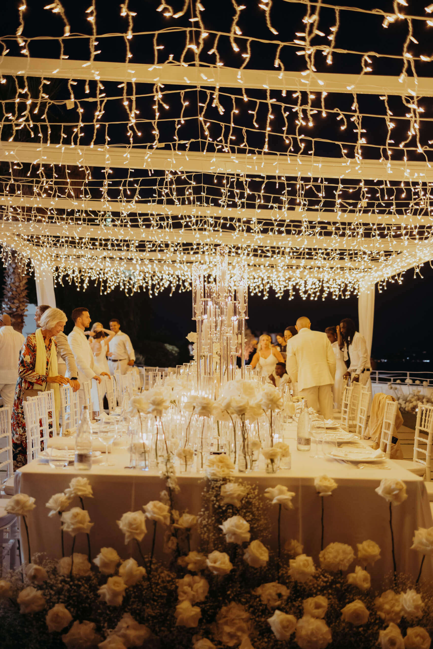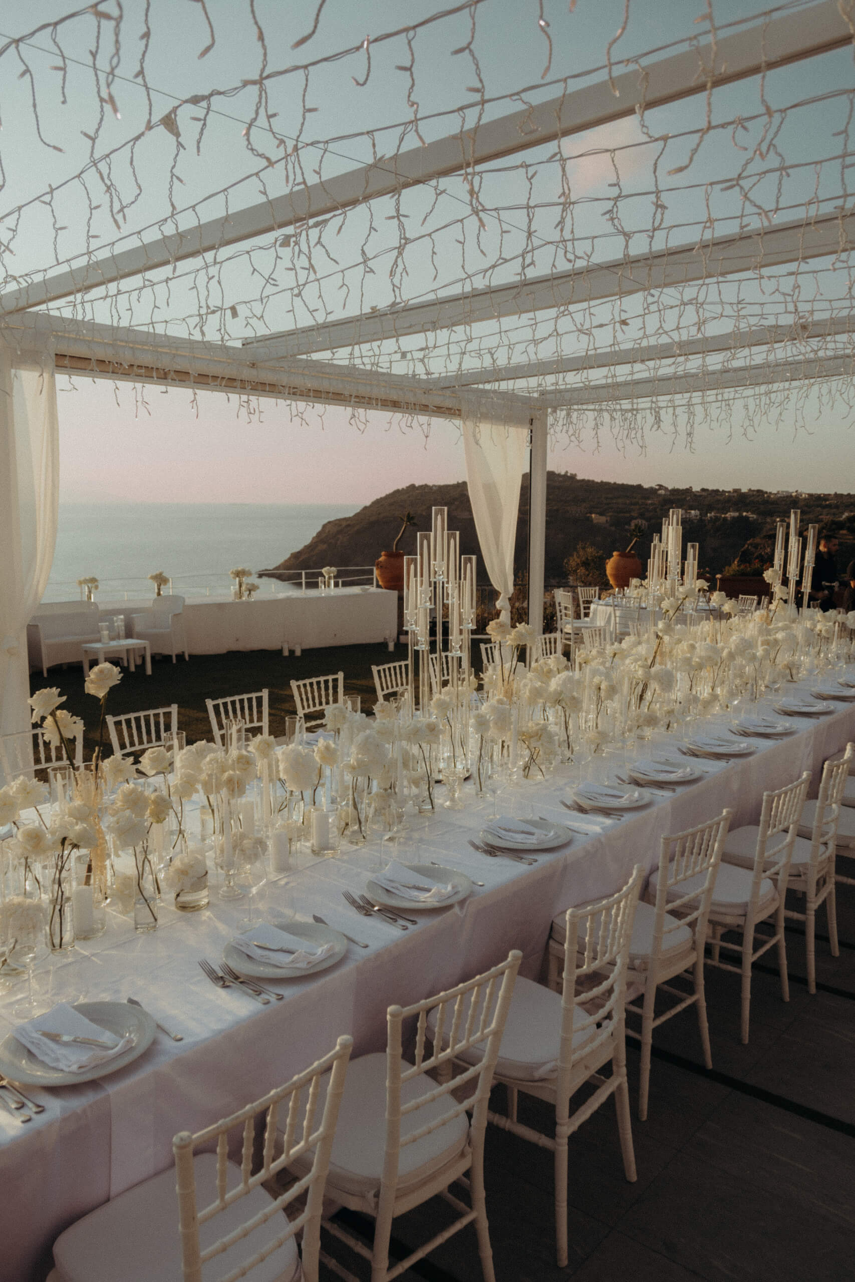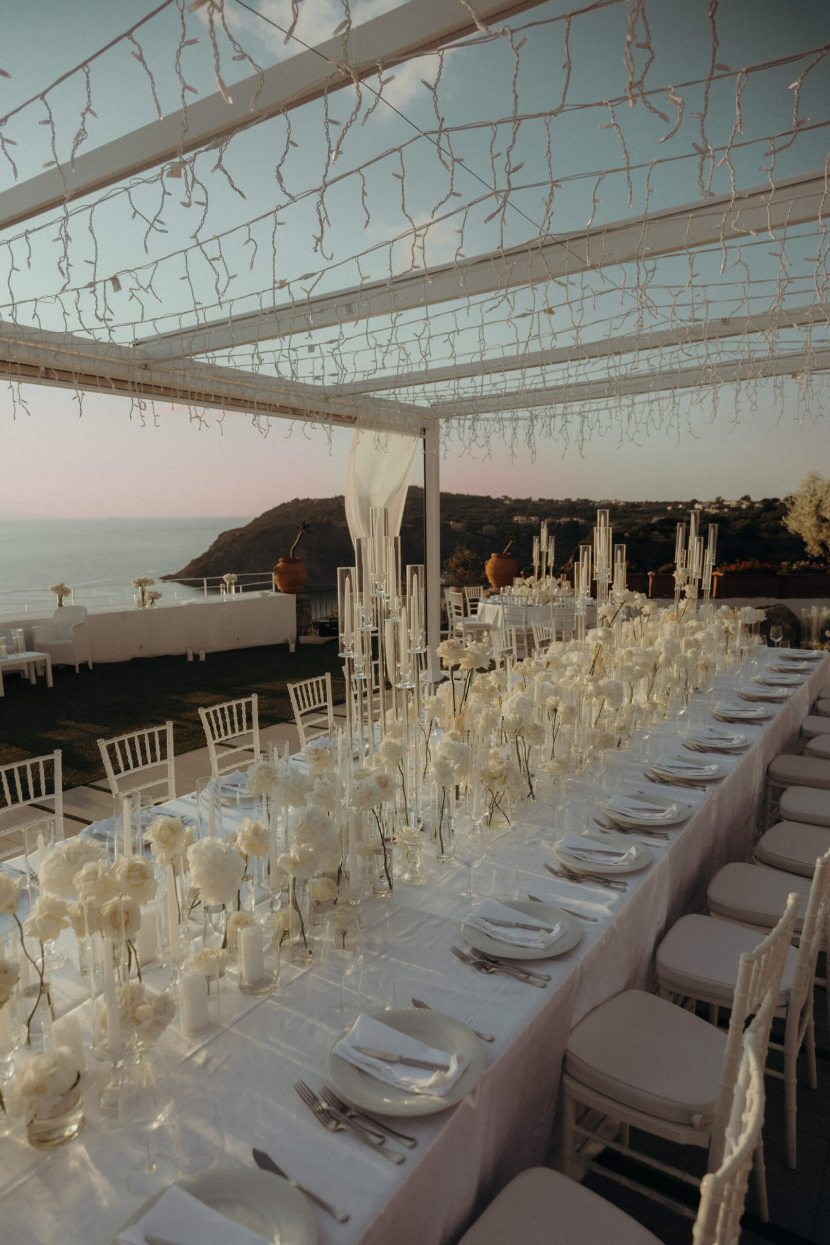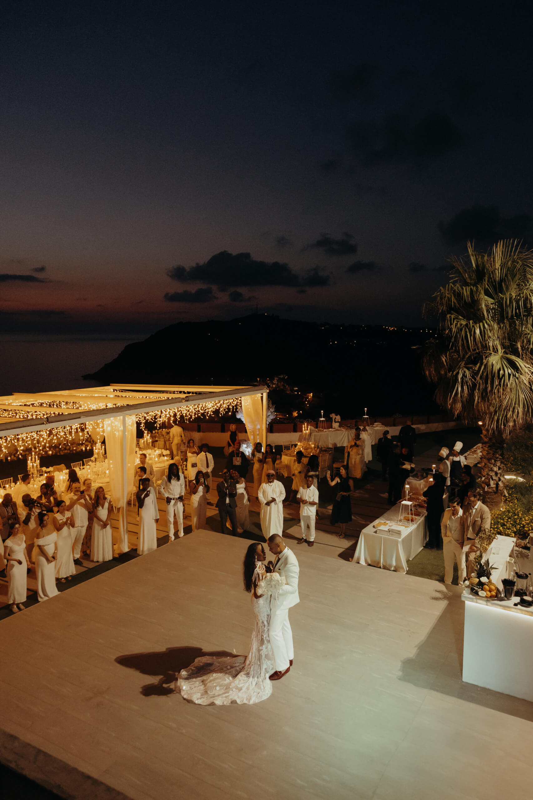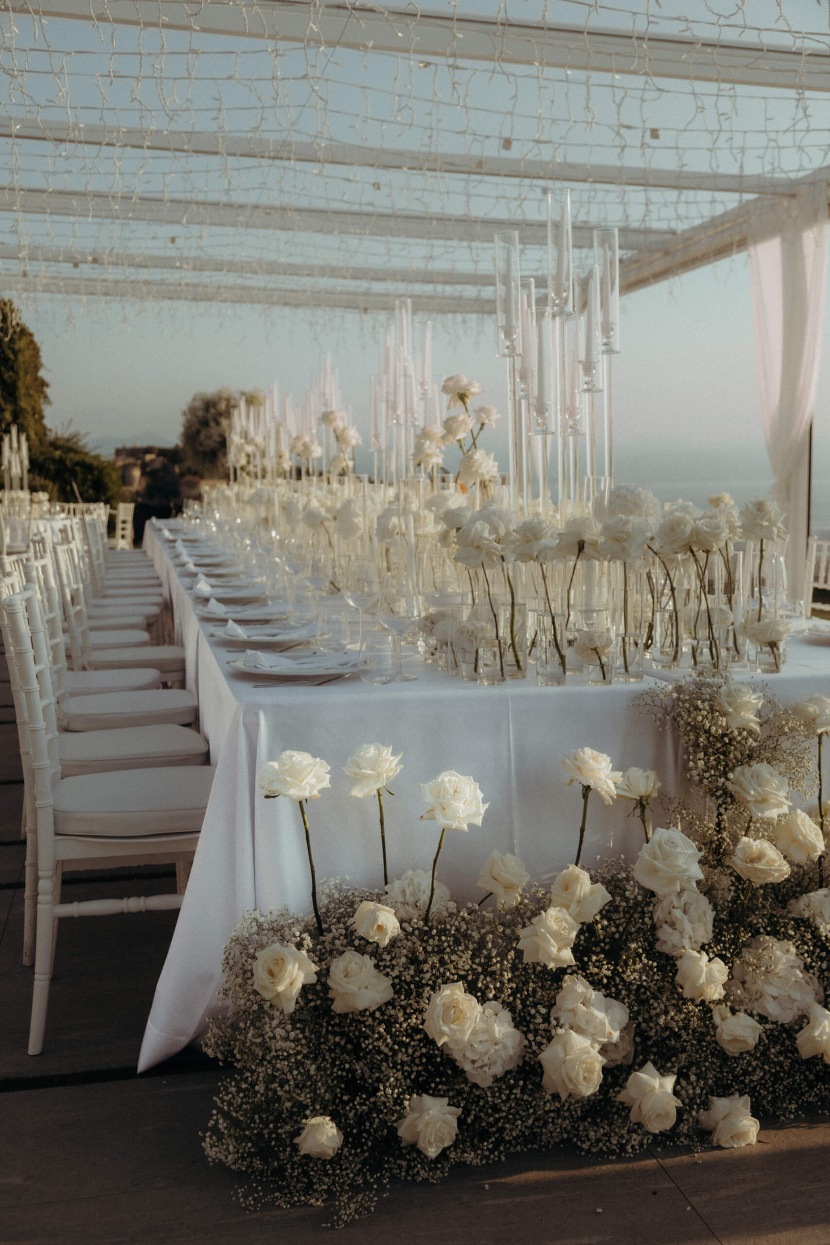 Imagine being immersed in a summer fairytale: a wedding atop a hill, offering views of a castle and volcano on one side, and the seaside with the Aeolian Islands on the other. A gorgeous 3×3 meter platform adorned with generous amounts of white English roses, delphiniums, and amaranthus; an elegant, romantic gazebo for dinner with light fabrics fluttering in the breeze as the sun sets over the islands. The night filled with magical lights: the moon, the starry reception sky, and 2-meter-large imperial tables with rich runners overflowing with glass chandeliers, candles, and flowers. And, to conclude, a small “volcanic eruption” made of a thousand red roses.