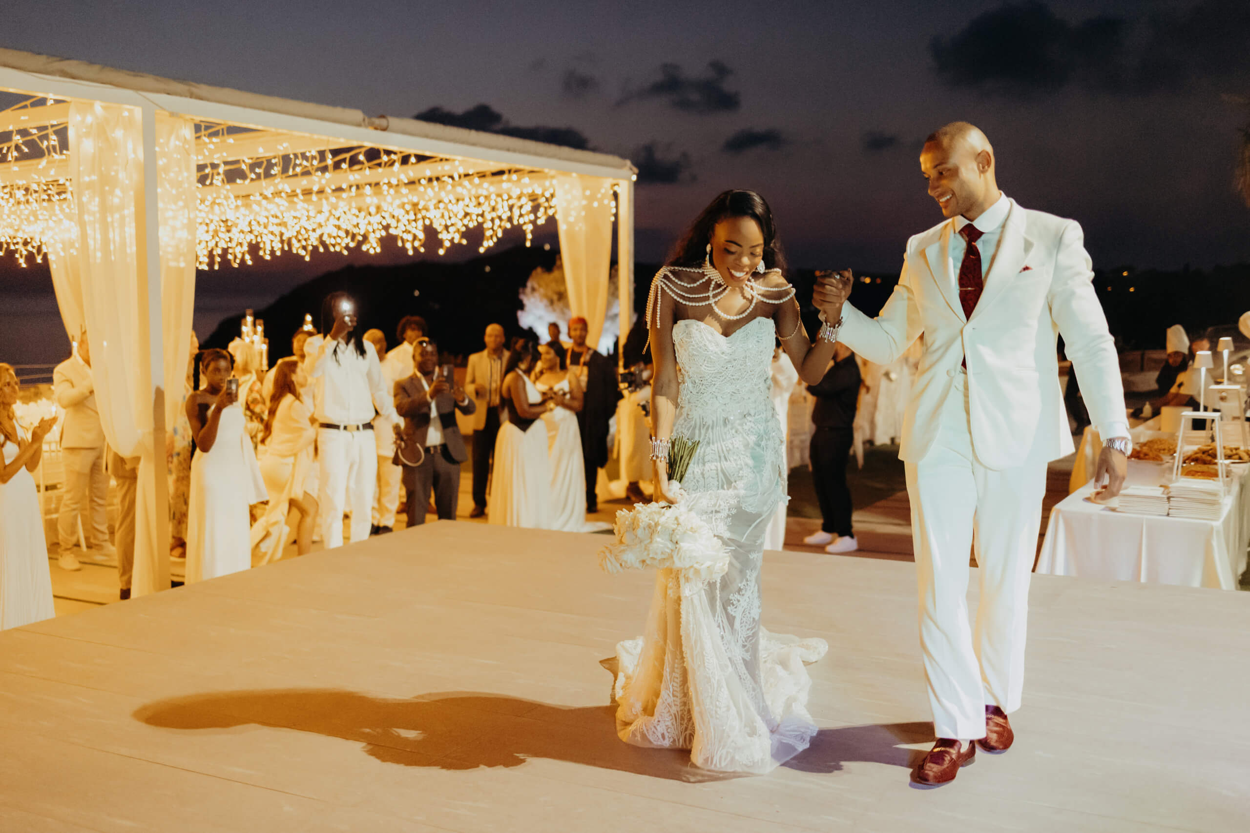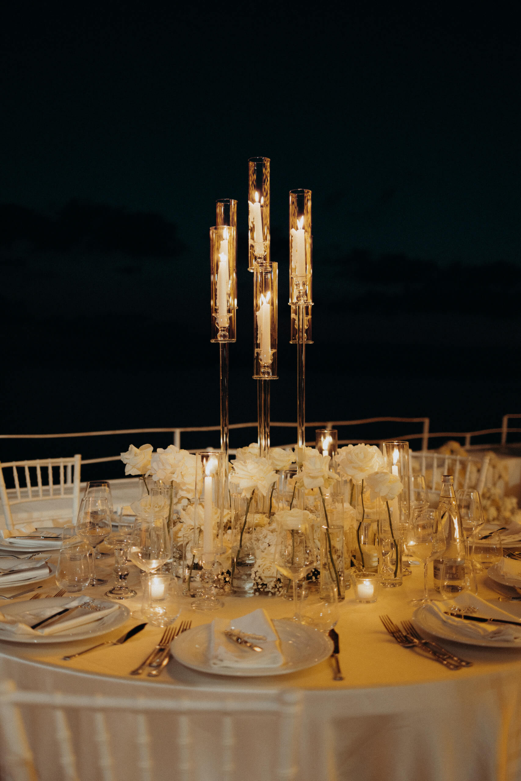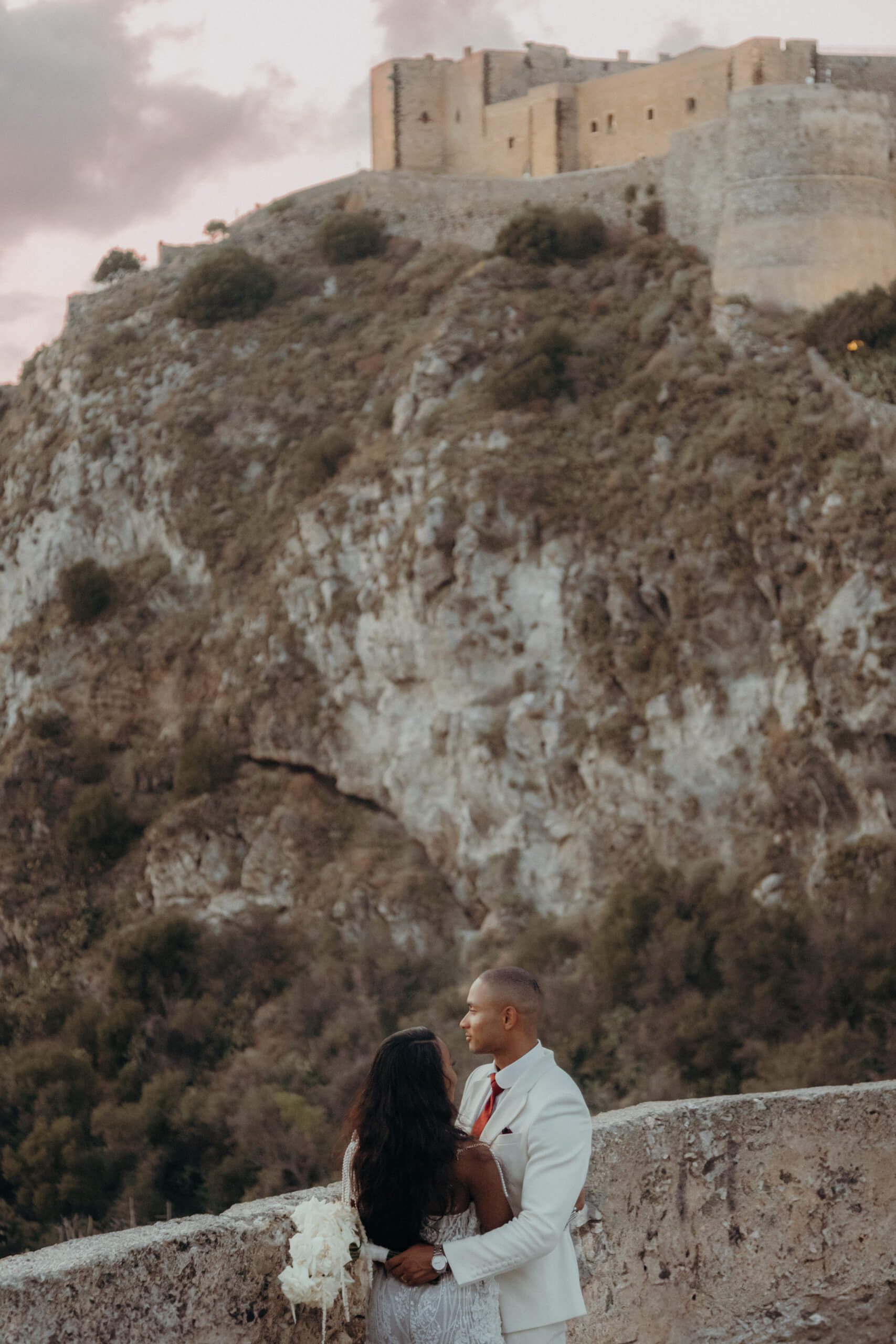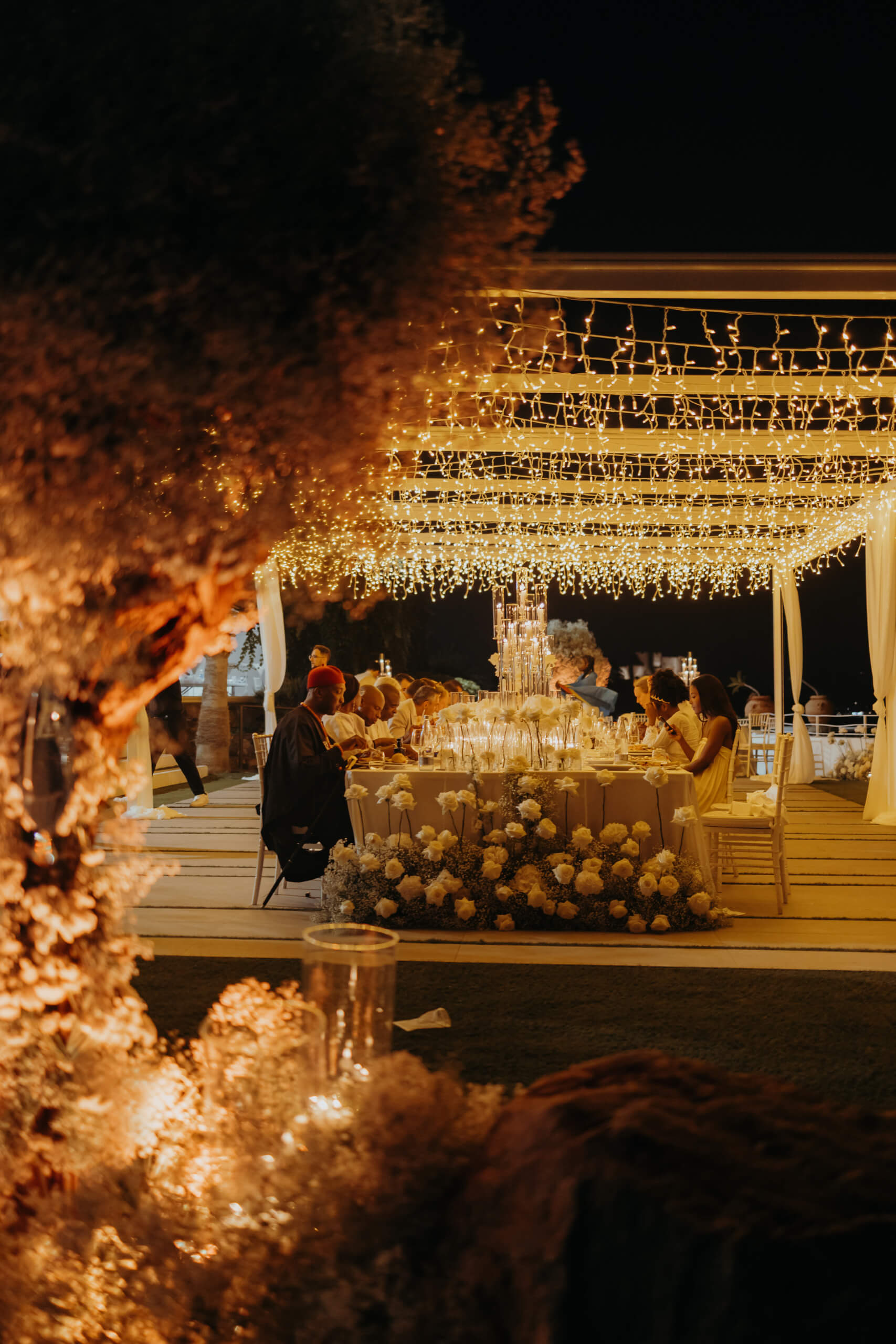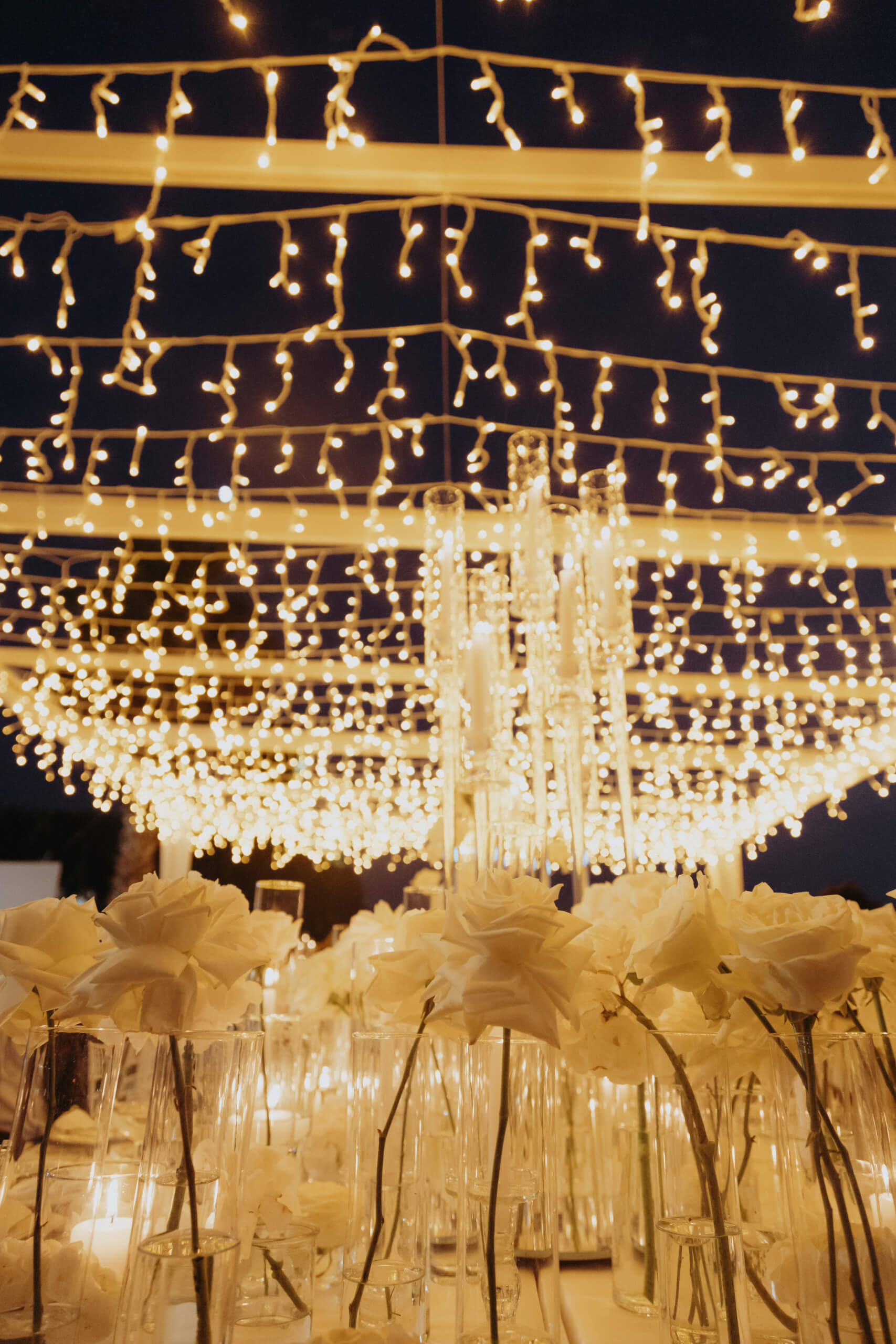 Imagine being immersed in a summer fairytale: a wedding atop a hill, offering views of a castle and volcano on one side, and the seaside with the Aeolian Islands on the other. A gorgeous 3×3 meter platform adorned with generous amounts of white English roses, delphiniums, and amaranthus; an elegant, romantic gazebo for dinner with light fabrics fluttering in the breeze as the sun sets over the islands. The night filled with magical lights: the moon, the starry reception sky, and 2-meter-large imperial tables with rich runners overflowing with glass chandeliers, candles, and flowers. And, to conclude, a small “volcanic eruption” made of a thousand red roses.