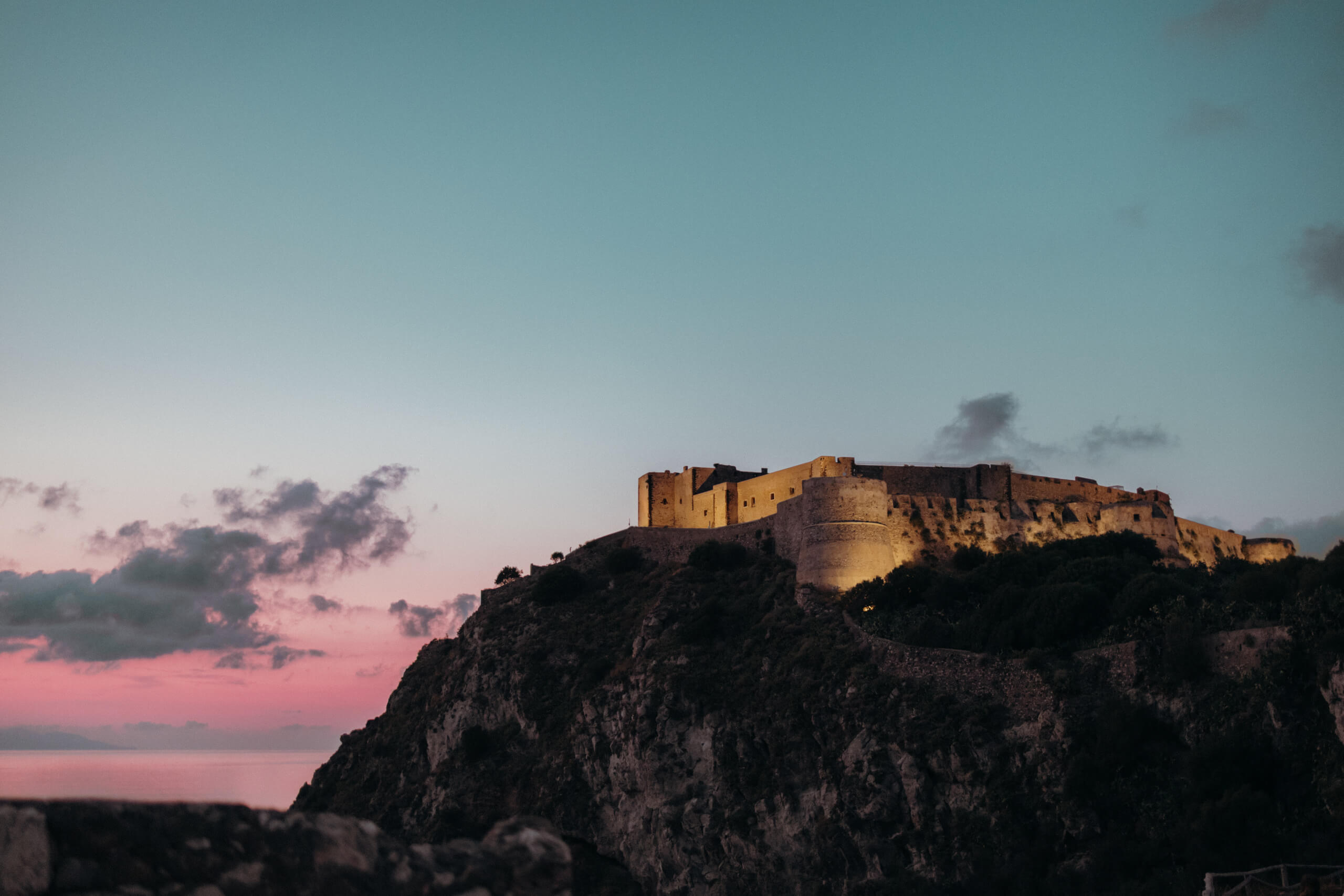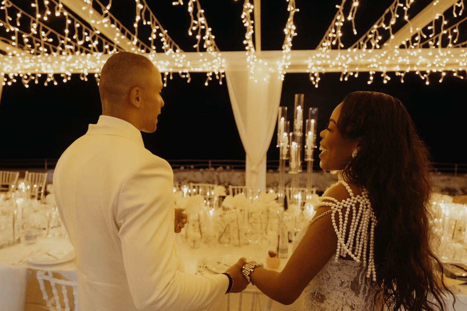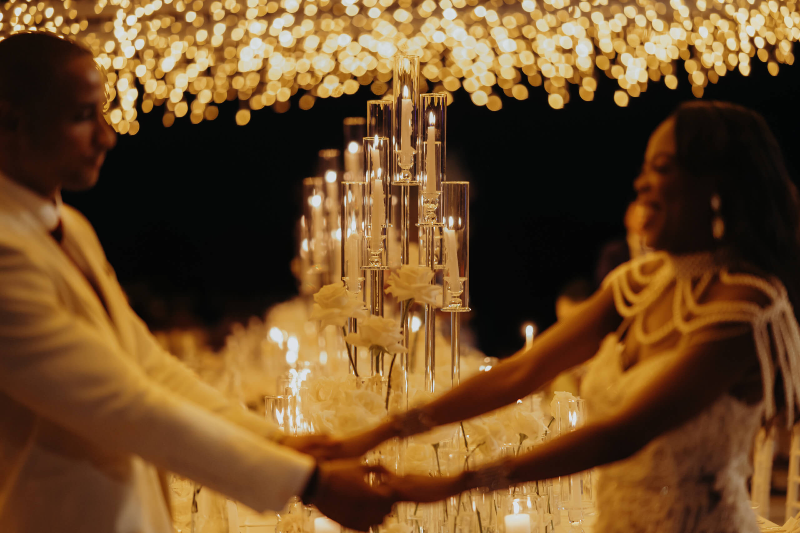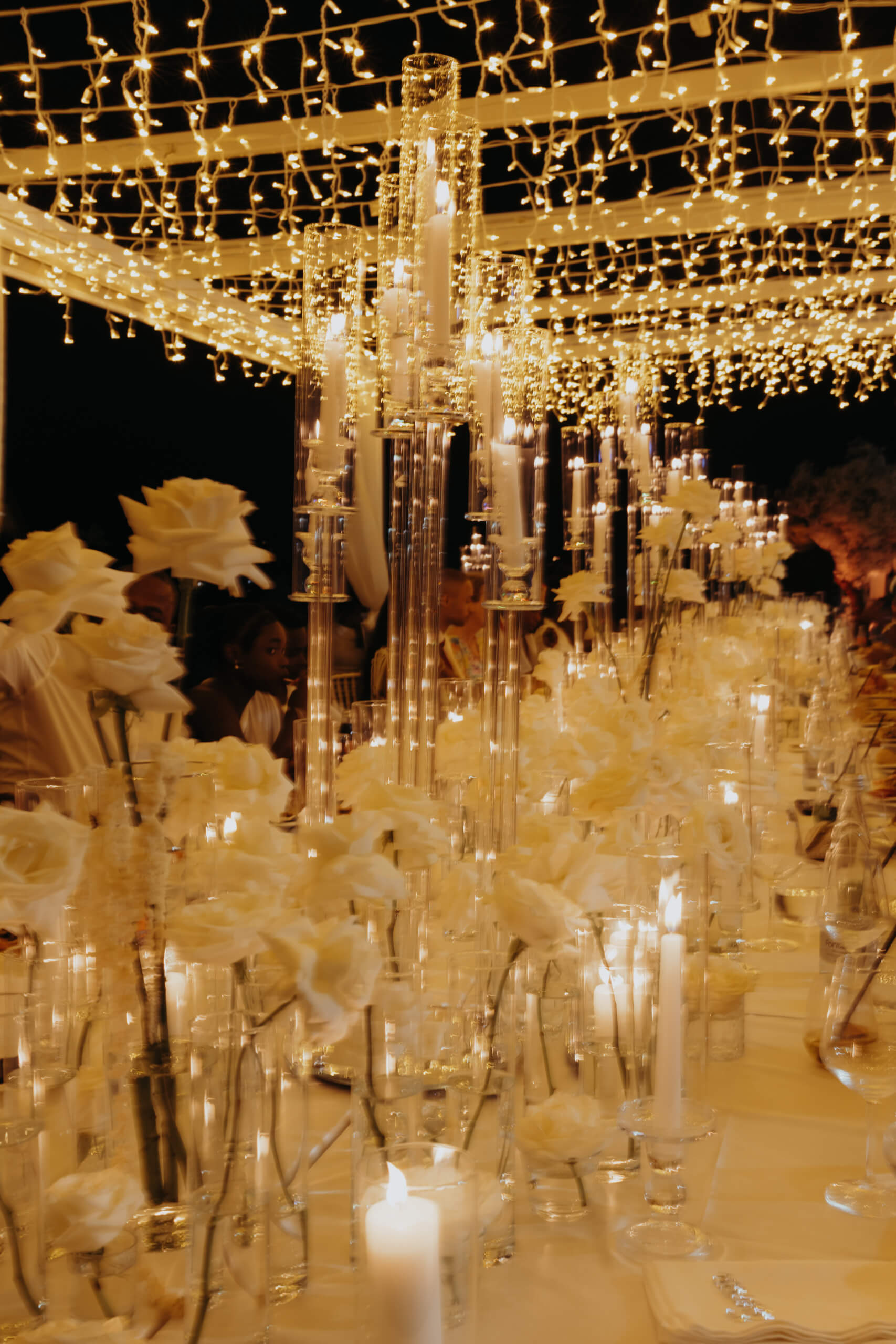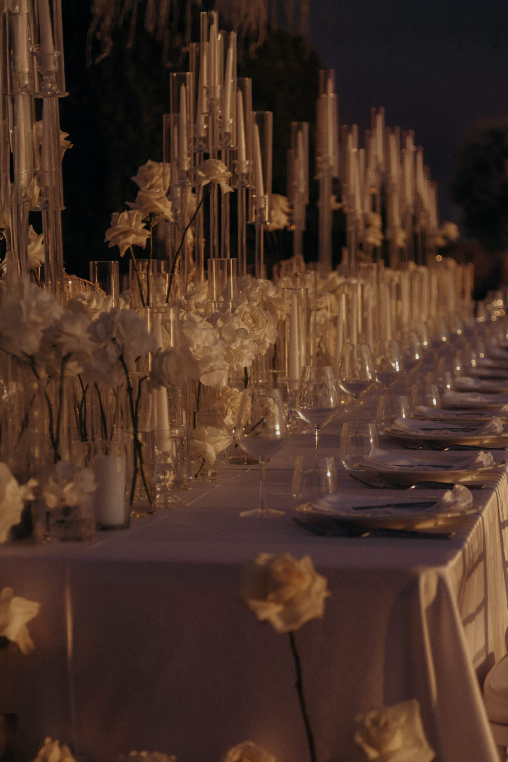 Imagine being immersed in a summer fairytale: a wedding atop a hill, offering views of a castle and volcano on one side, and the seaside with the Aeolian Islands on the other. A gorgeous 3×3 meter platform adorned with generous amounts of white English roses, delphiniums, and amaranthus; an elegant, romantic gazebo for dinner with light fabrics fluttering in the breeze as the sun sets over the islands. The night filled with magical lights: the moon, the starry reception sky, and 2-meter-large imperial tables with rich runners overflowing with glass chandeliers, candles, and flowers. And, to conclude, a small “volcanic eruption” made of a thousand red roses.
