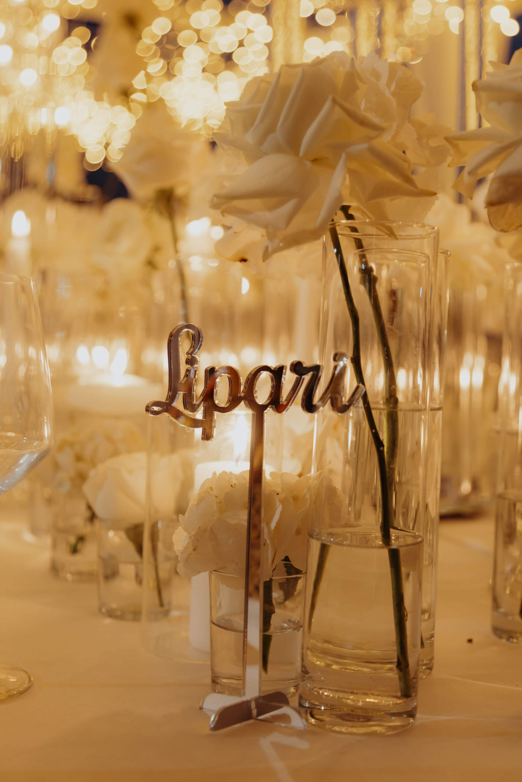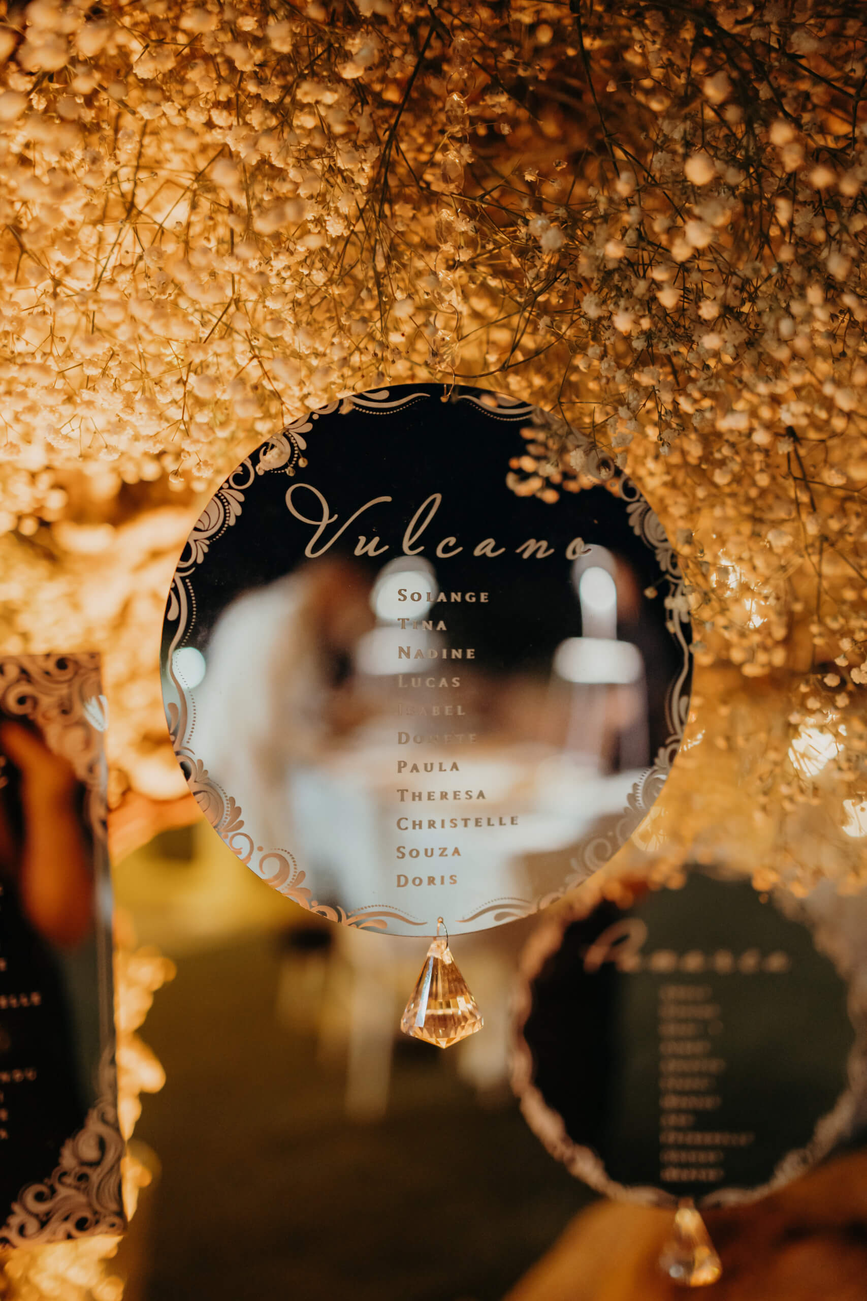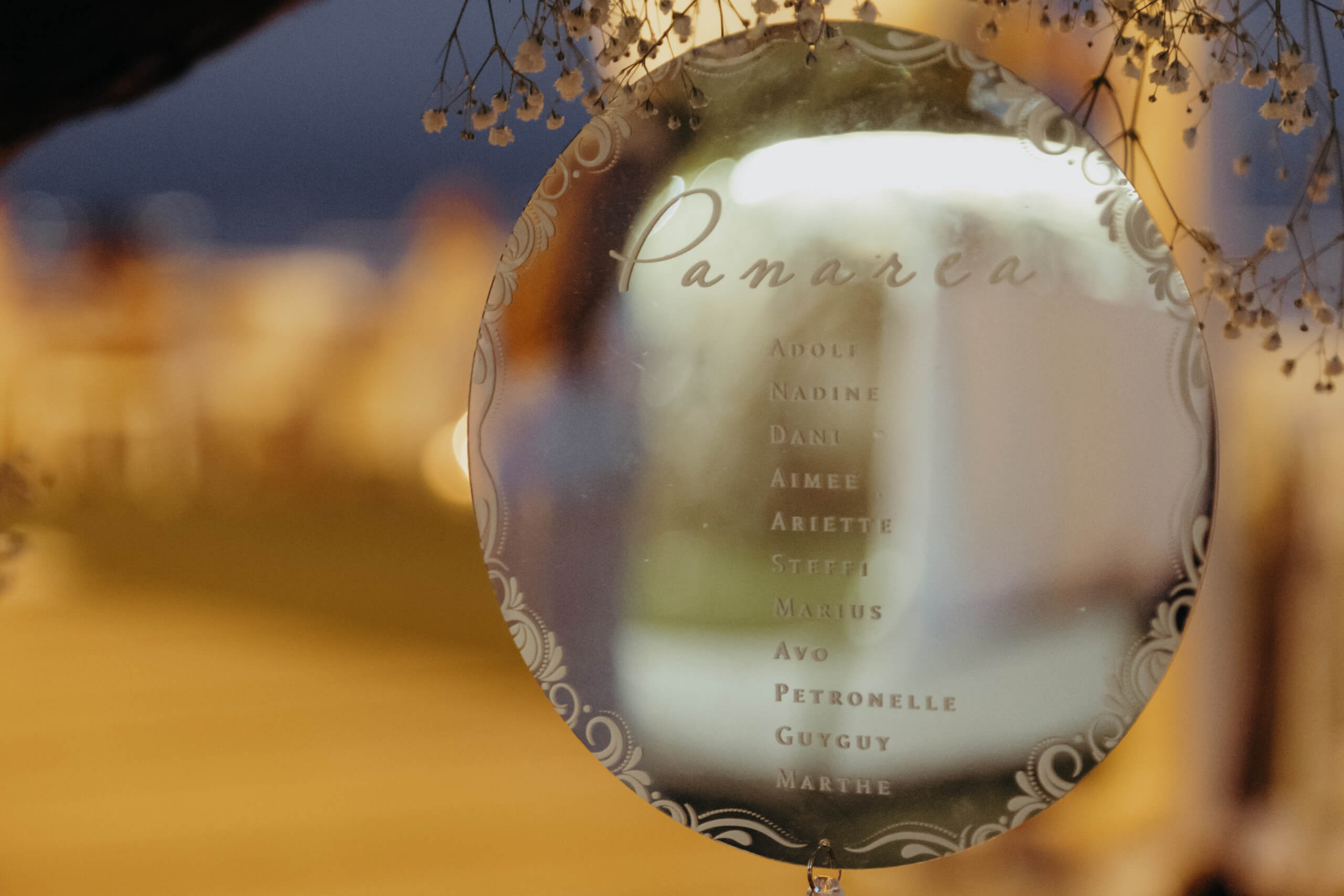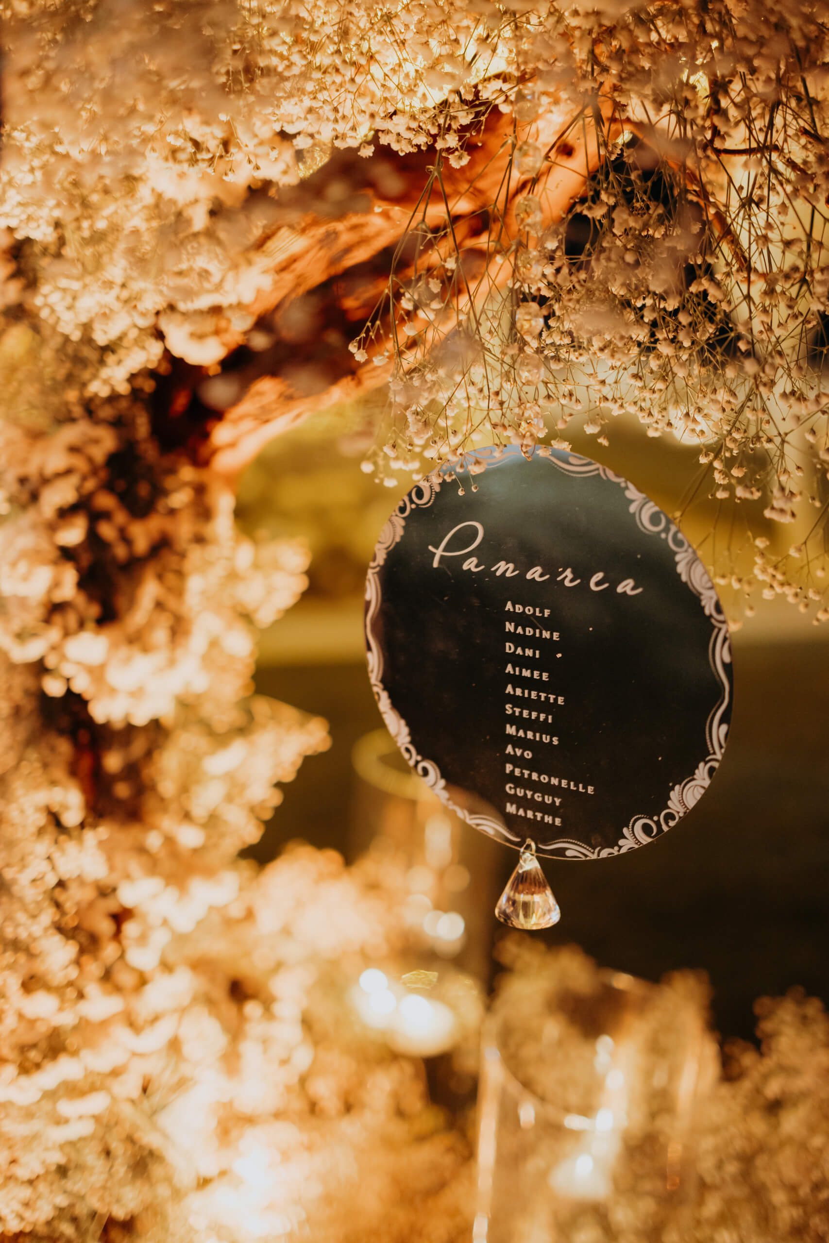 A truly unique piece was the custom-built trees welcoming guests at the tables. The bride admired luminous trees with many lights, a popular style in Belgium. Just two months before the wedding, she sought a similar solution, which was practically impossible to order externally (pre-ordering custom design elements, if unavailable locally, requires 6 to 8 months’ notice). The trees were created in-house from real baby’s breath, and I suggested using them for the tableau de marriage (seating chart), crafted from mirrored plexiglass pieces for each table. This original solution was well-received, with many guests using the trees with hanging mirrors with their names as a photobooth.