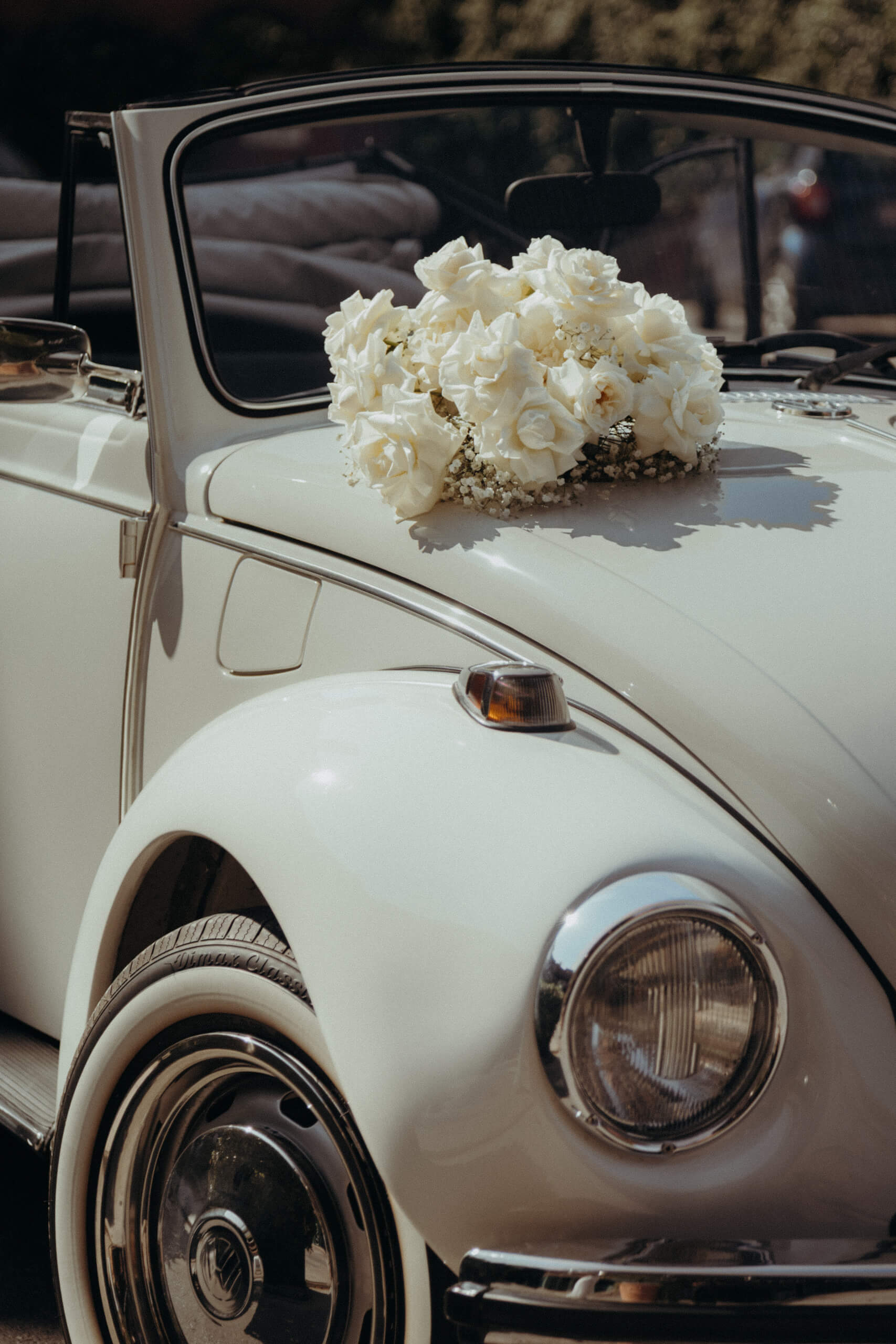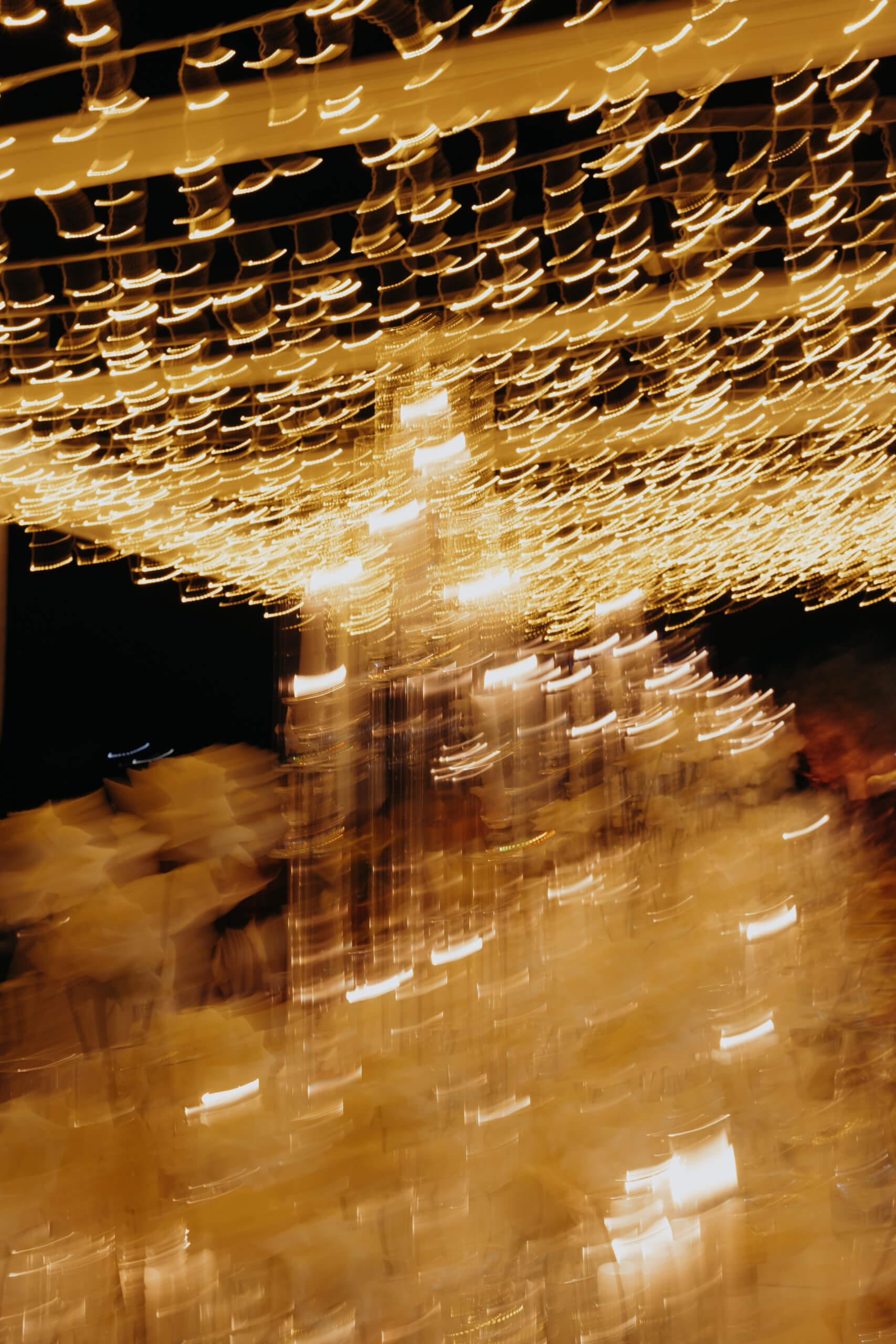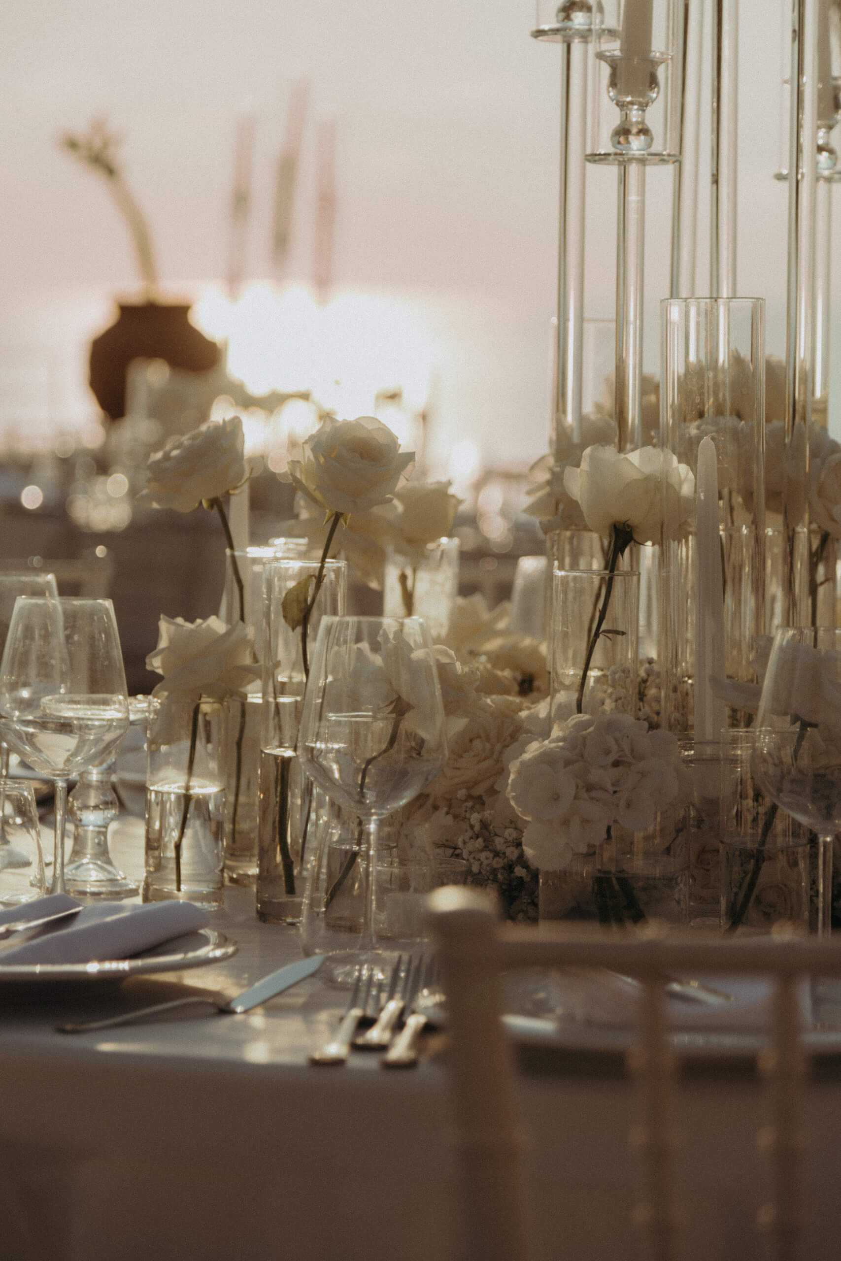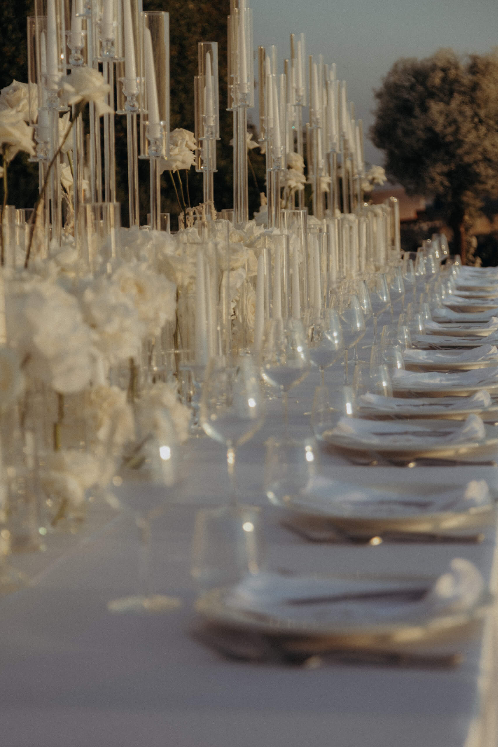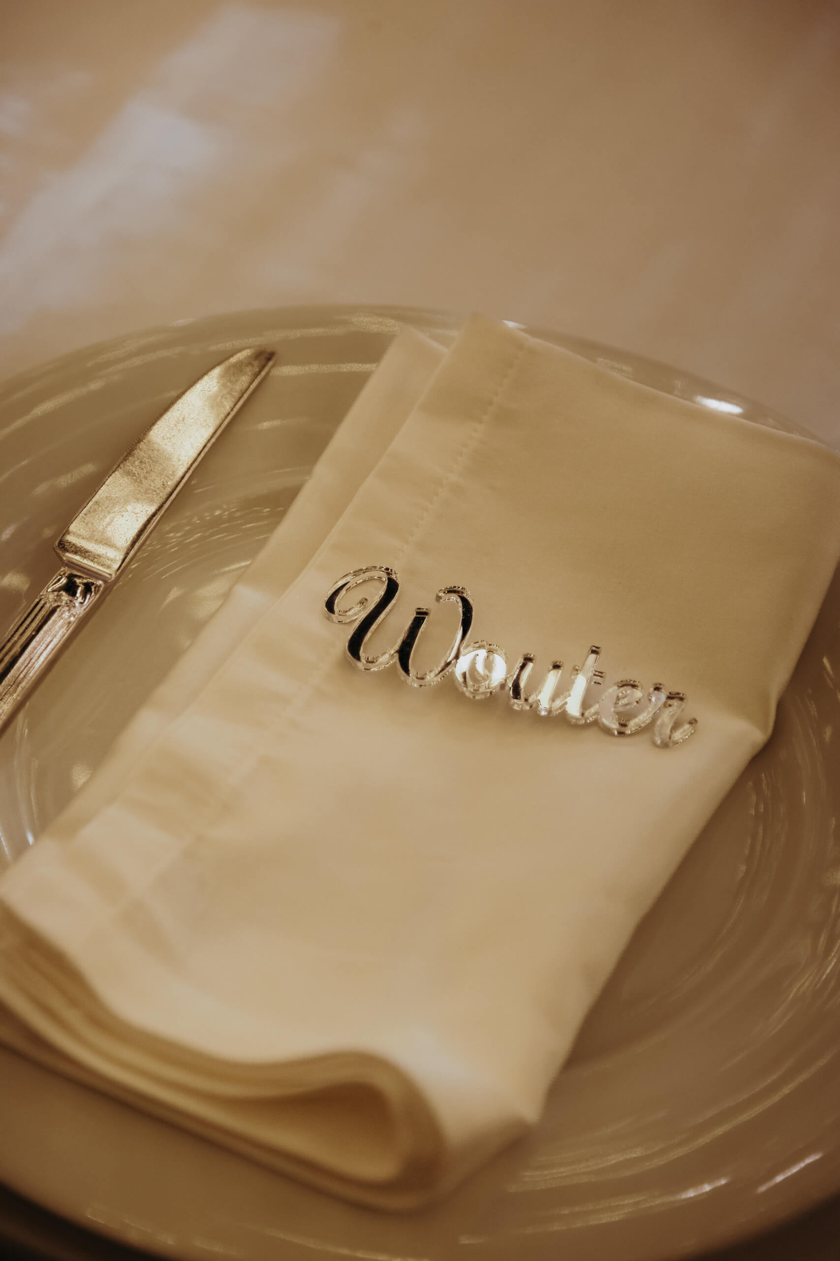 A truly unique piece was the custom-built trees welcoming guests at the tables. The bride admired luminous trees with many lights, a popular style in Belgium. Just two months before the wedding, she sought a similar solution, which was practically impossible to order externally (pre-ordering custom design elements, if unavailable locally, requires 6 to 8 months’ notice). The trees were created in-house from real baby’s breath, and I suggested using them for the tableau de marriage (seating chart), crafted from mirrored plexiglass pieces for each table. This original solution was well-received, with many guests using the trees with hanging mirrors with their names as a photobooth.