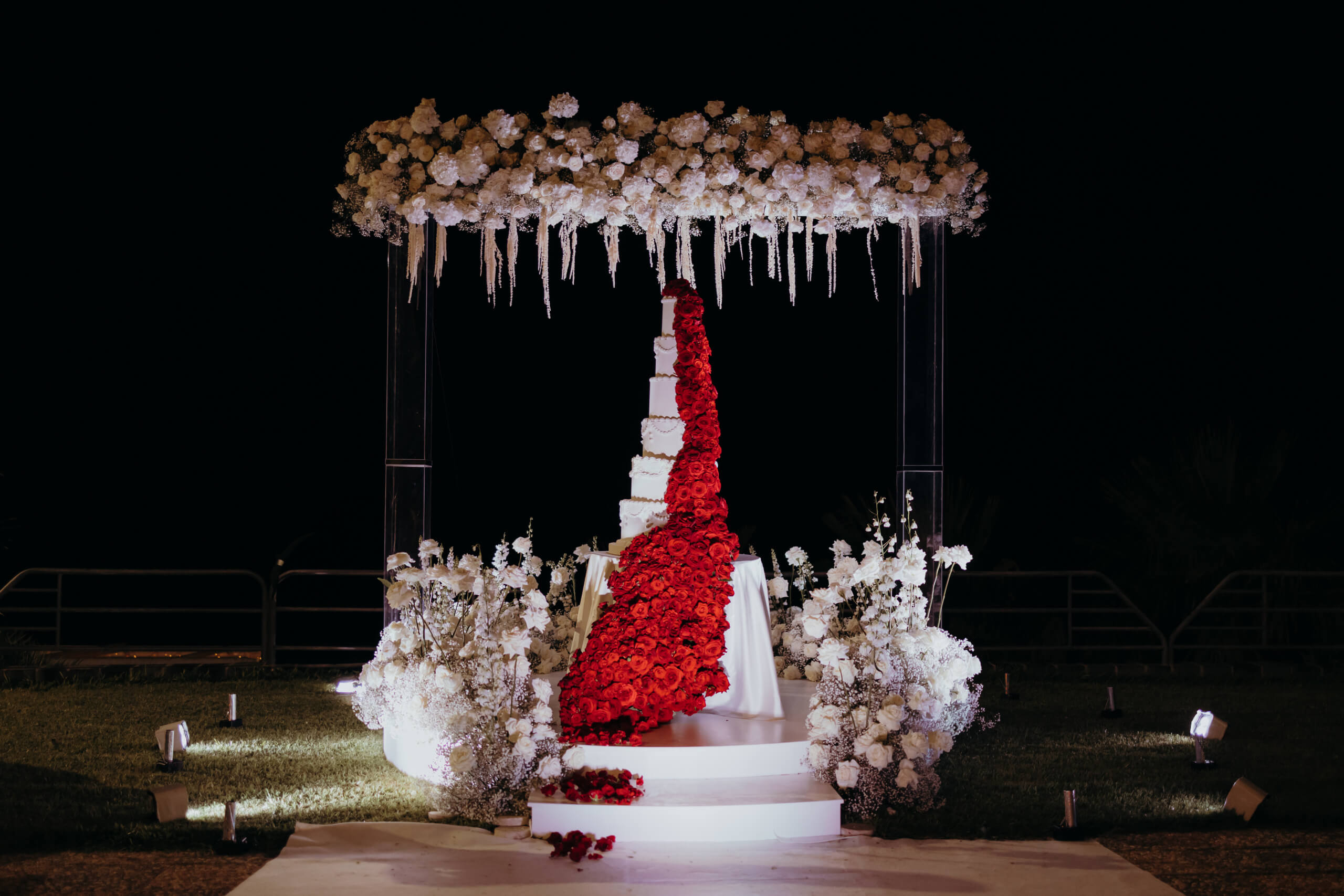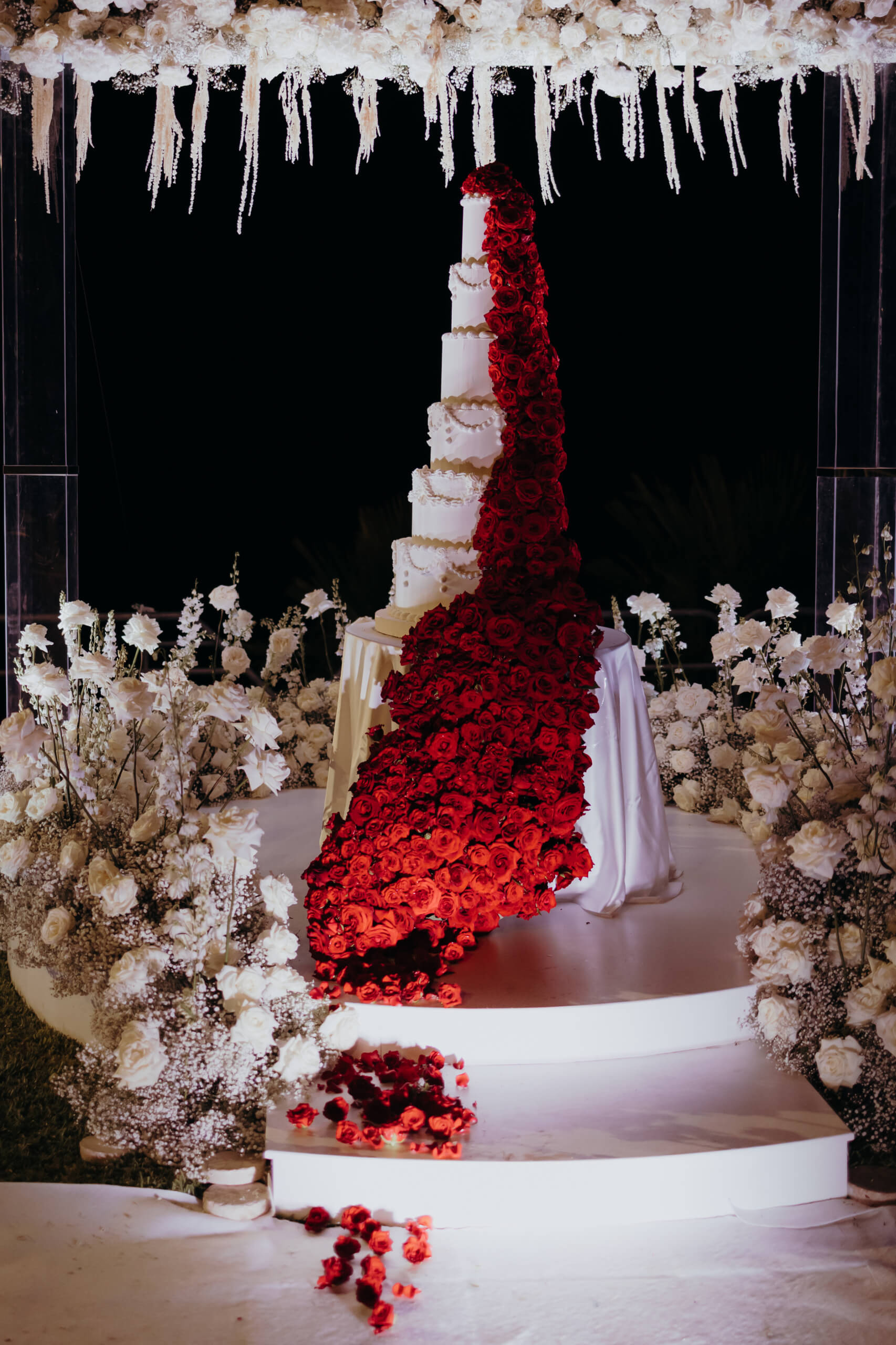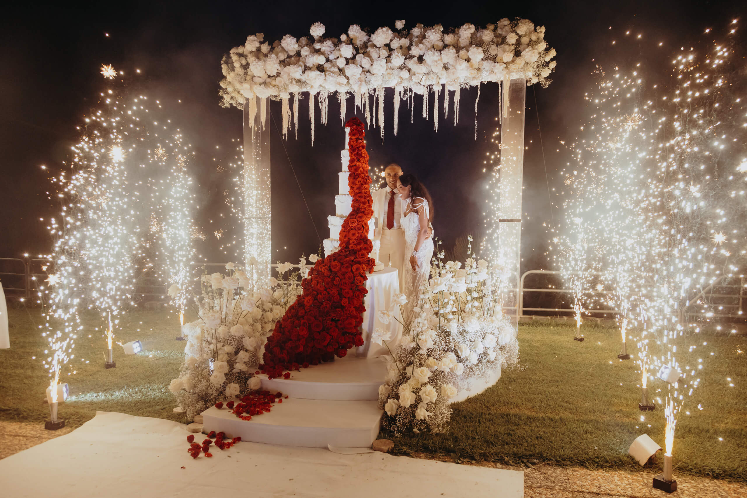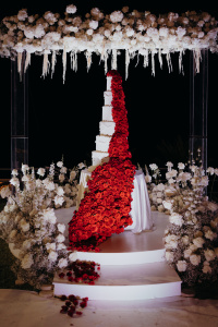With a focus on sustainability, we repurposed the ceremony area for the cake cutting. The six-tiered wedding cake was absolutely breathtaking, its fire-red color standing apart from the main wedding theme. This vibrant hue represented Mount Etna’s lava flow and was achieved with approximately one thousand red roses. It served as a tribute from the groom, expressing his admiration and respect for the local volcano.