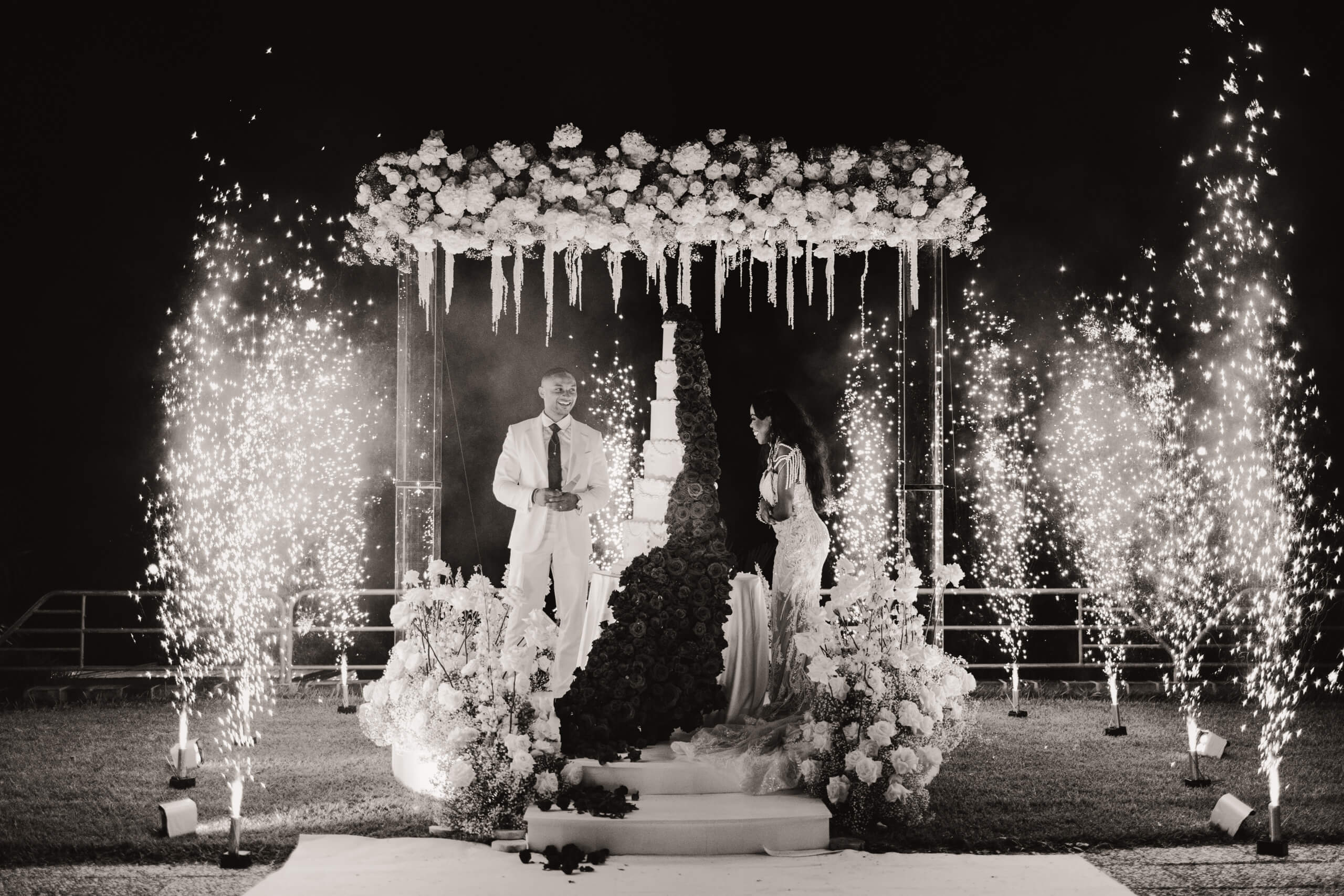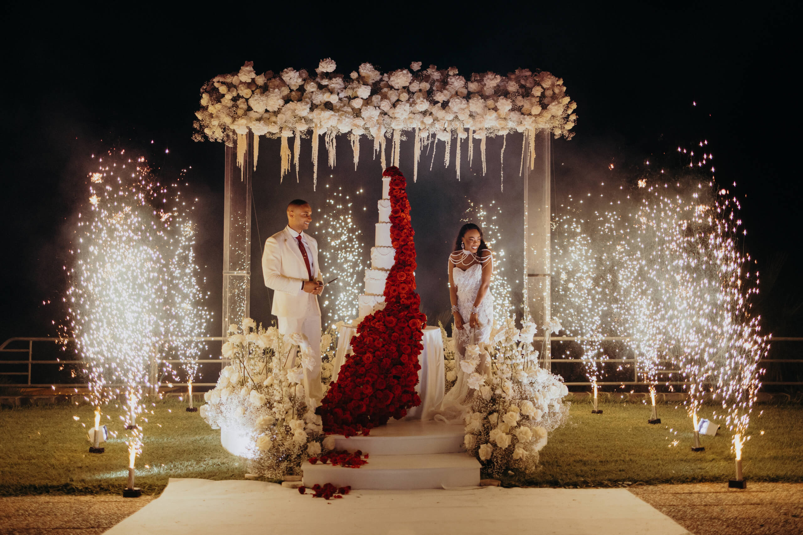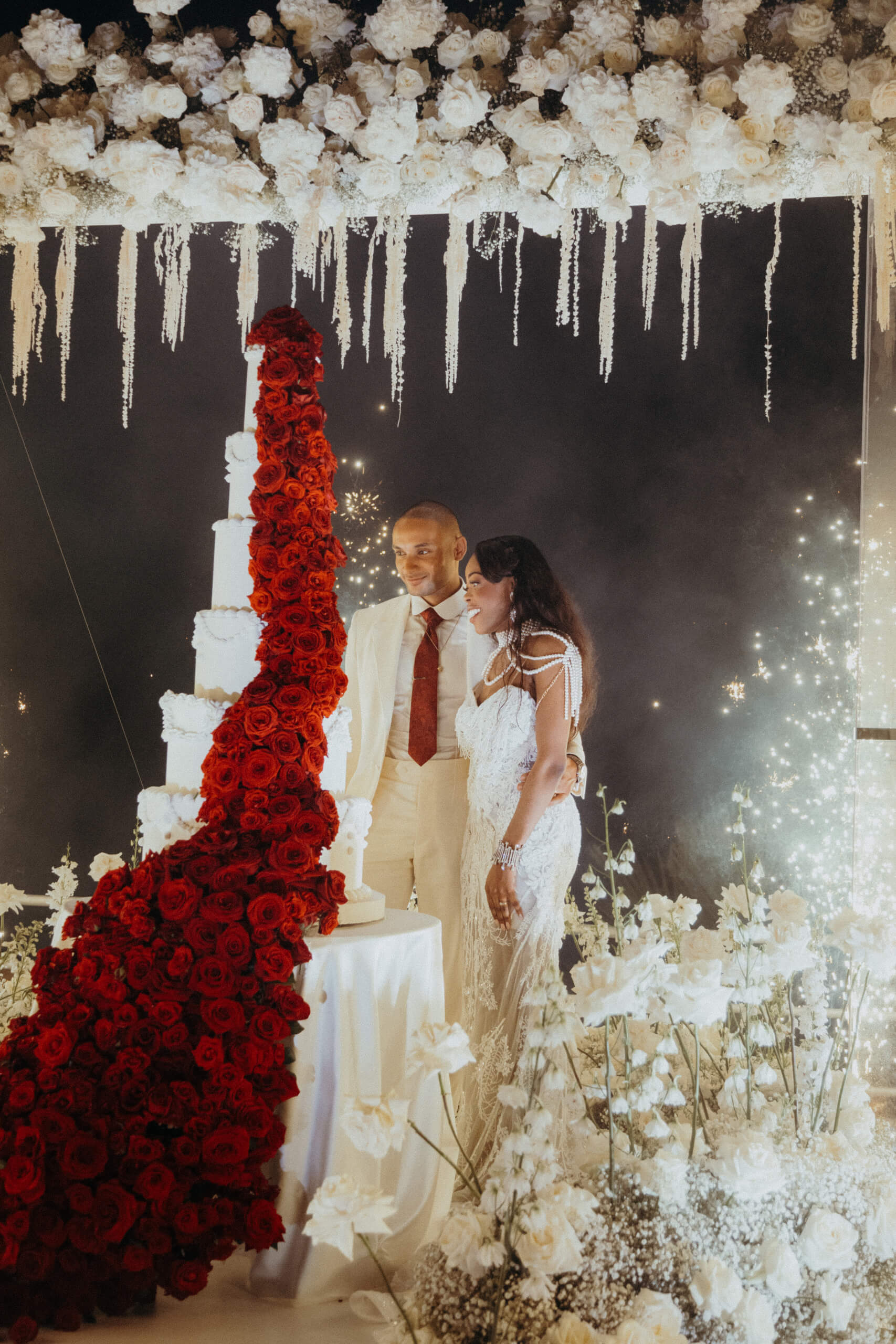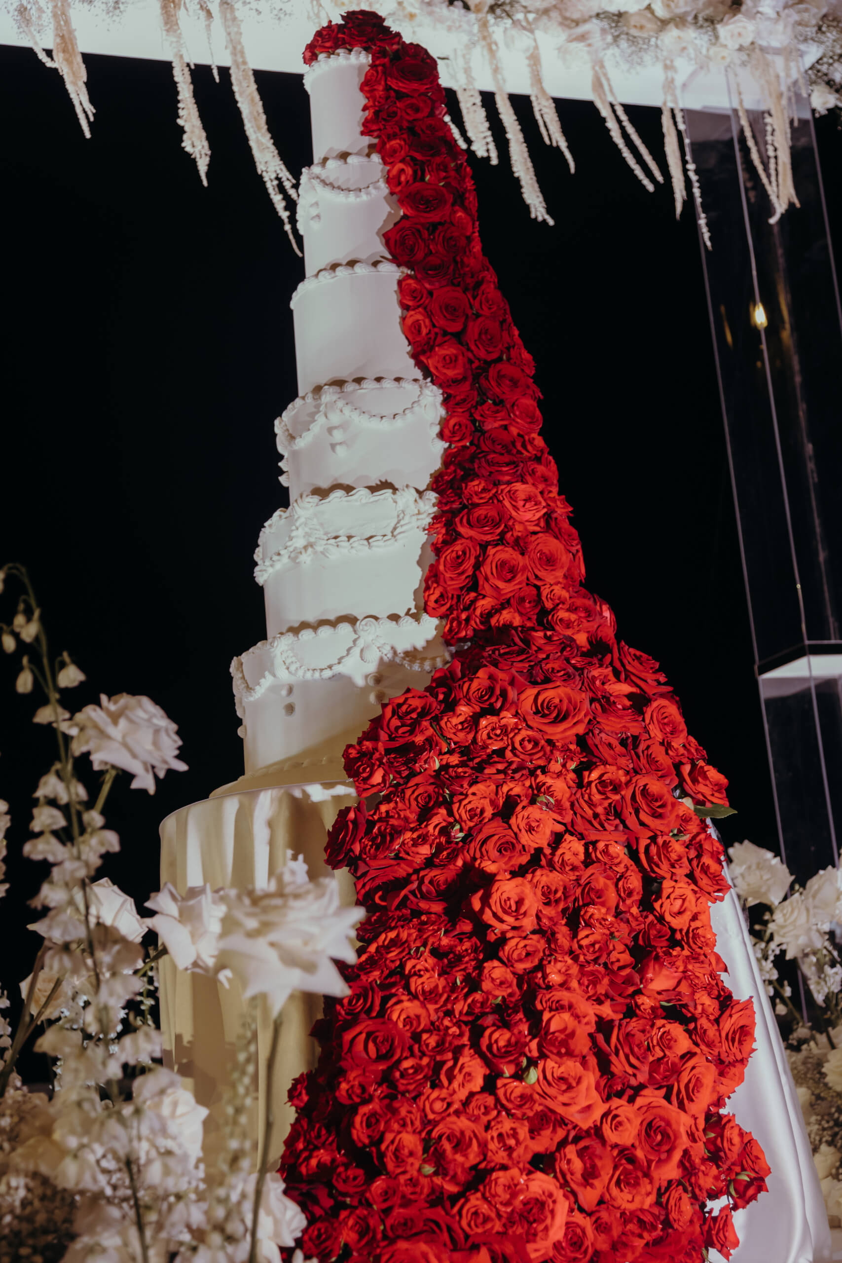 With a focus on sustainability, we repurposed the ceremony area for the cake cutting. The six-tiered wedding cake was absolutely breathtaking, its fire-red color standing apart from the main wedding theme. This vibrant hue represented Mount Etna’s lava flow and was achieved with approximately one thousand red roses. It served as a tribute from the groom, expressing his admiration and respect for the local volcano.
